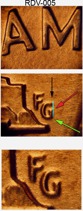 But also look at the blue line in the 5th pic of your first post. It shows the relative distances of the top of the G with the crossbar...notice how in the RDV-005, the top of the G extends at least as far as the crossbar of the G if not farther, with the RDV-006 stopping noticeably shorter of the crossbar. Now, compare that to the first picture of your first post...you will see that the top of the G does not extend over the crossbar.