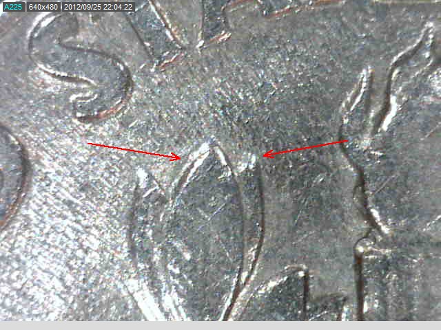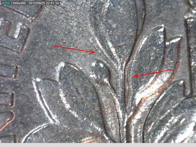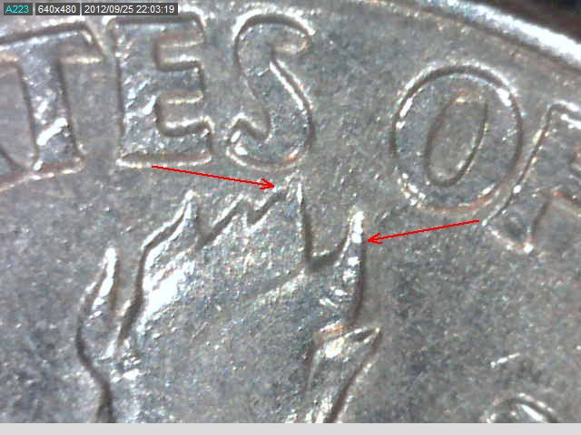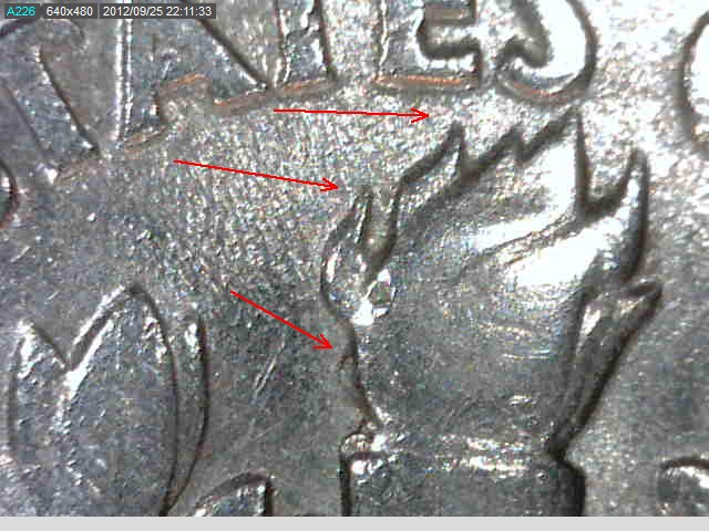 Here is the coin: The tips of the flames appear to be split and there are other areas as marked. Another pocket change special, well banged up. As always thanks for your time and input!