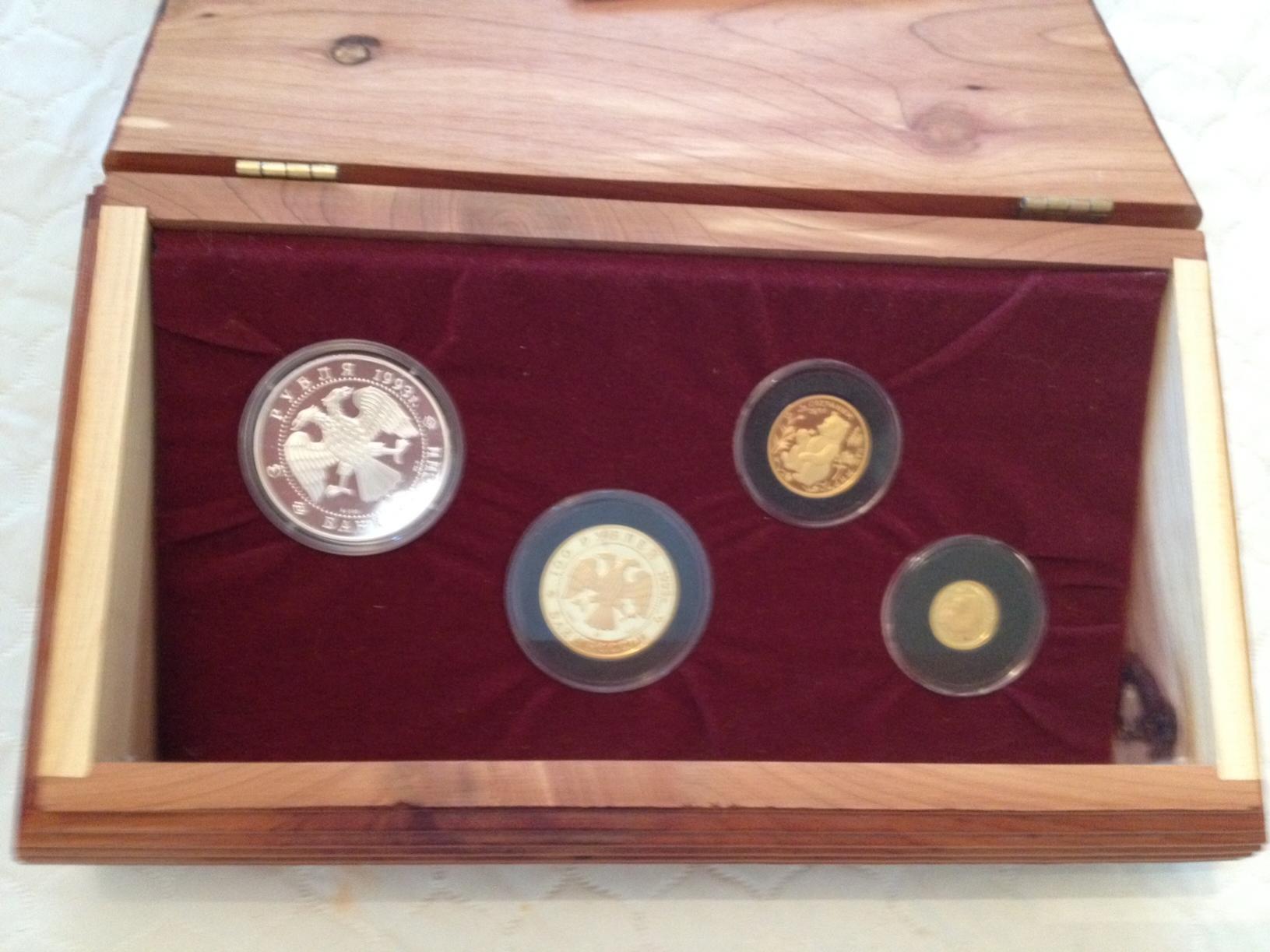 It has a Gold 100 Roubles proof, Gold 50 Roubles proof, Gold 25 Roubles proof, and Silver proof weighing 31.1 grams.
