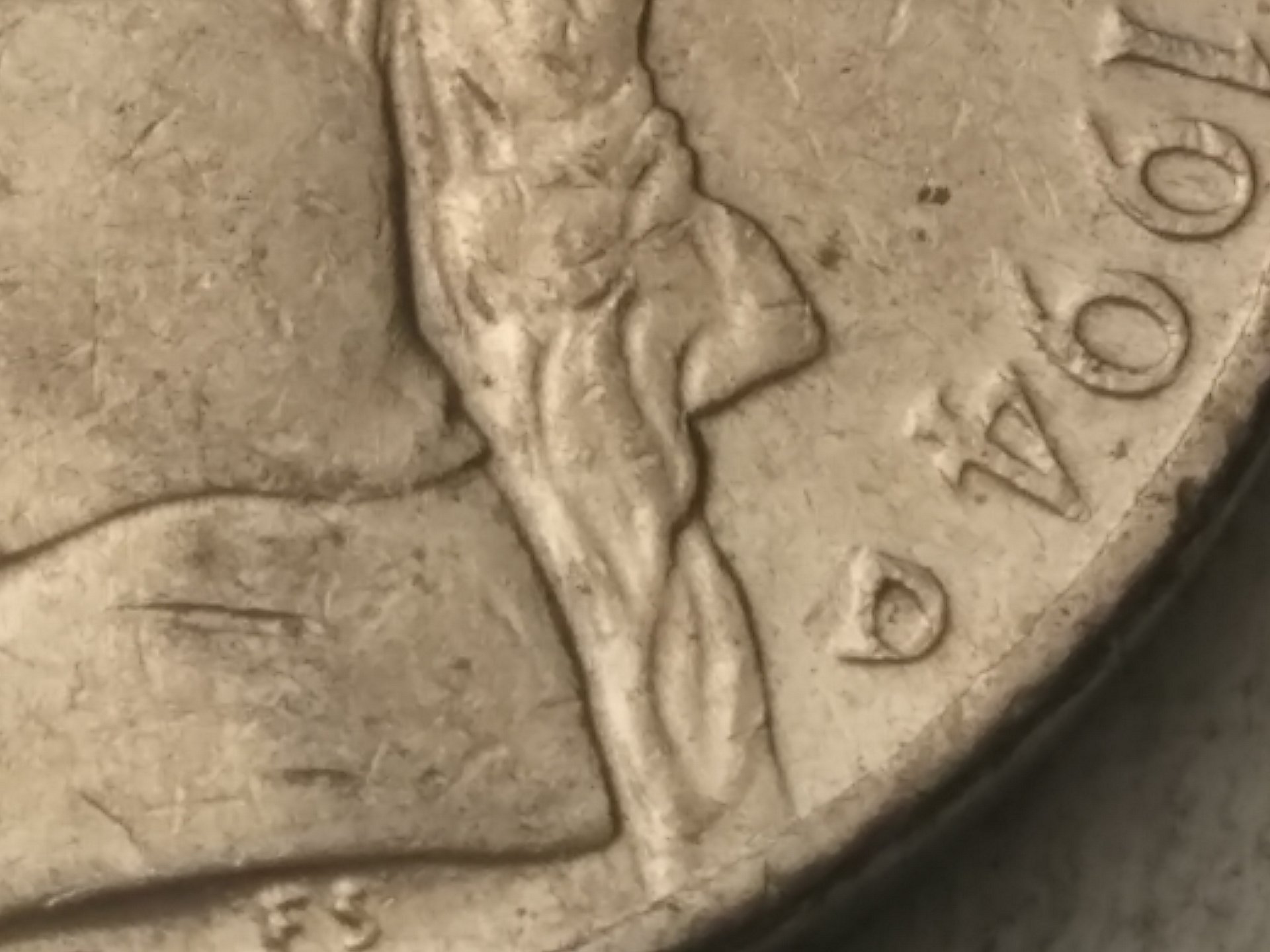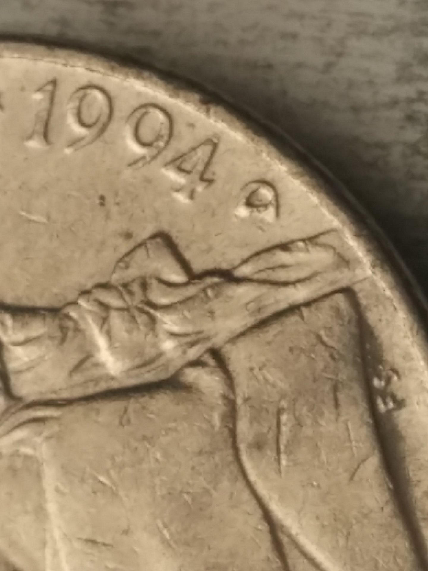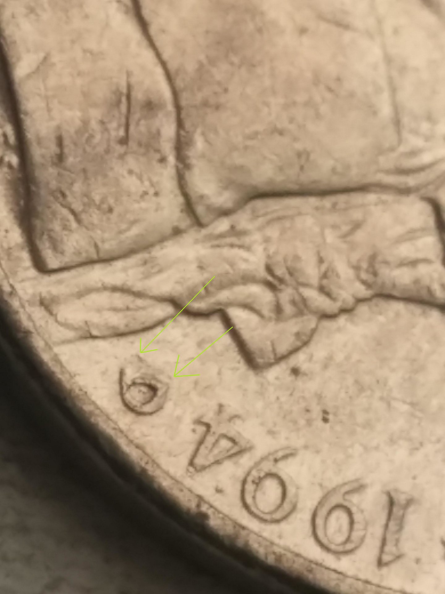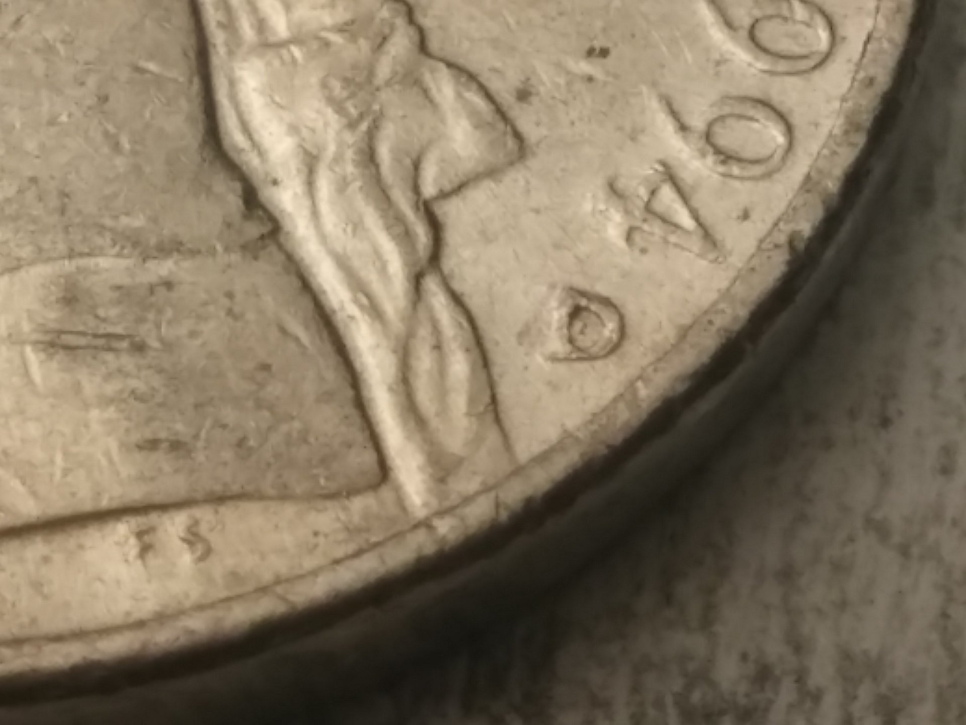 Now I see what you are talking about. As Tommy and Markus pointed out, it's just damaged. Could have been from a coin wrapping machine or a well placed hit. After 1989 the mint stopped hand-punching the mint marks into the dies, so there are no RPMs after 1989.