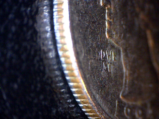 Would the rim of a planchet be affected if a coin is struck through grease? Just wondering, I don't know. It would seem to me that the strike would only affect the field, device, legend, etc. The rim on this coin seems to be weak in the same area where the motto is weak, which makes me think PMD. The "V" stamp showed up in this post too: http://www.cointalk.com/t119924/ If you click on "emilysmith08015" pic (on my browser it appears as a broken link), the quarter shows a very similar "V" on it.