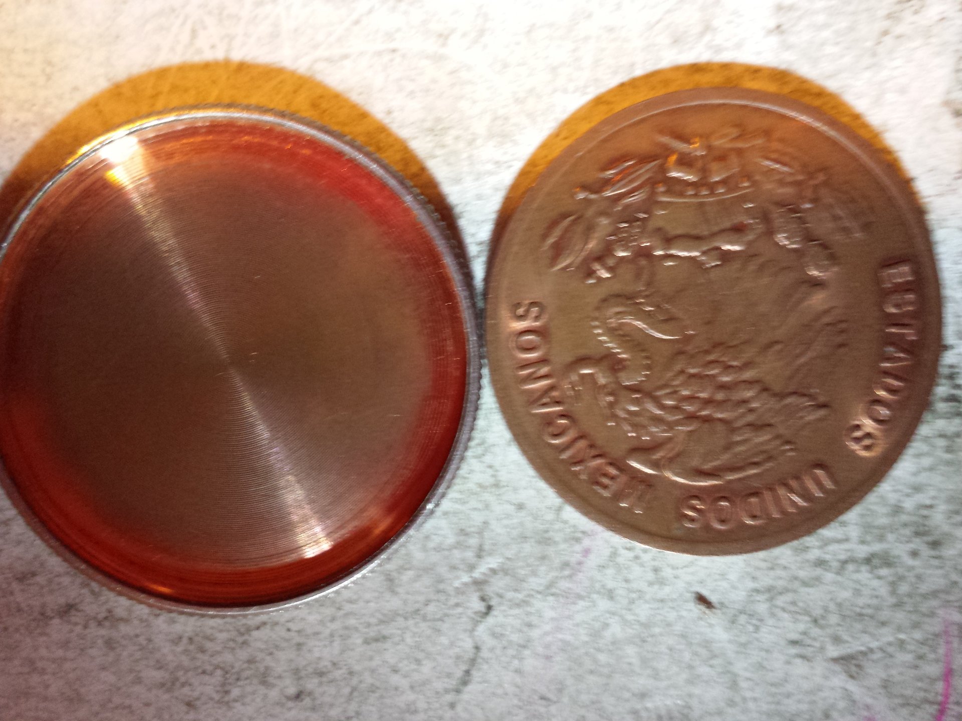 Nice. A machined Kennedy! They use them for magic tricks sold at magic and gaff shops. Looks like the trick were you show the Mexican coin then cover it up with the Obverse Kennedy and it slips into the Reverse making the Mexican coin disappear! Kool trick. It's called the SCOTCH and SODA trick. Google it and you will see videos on how it's performed!
