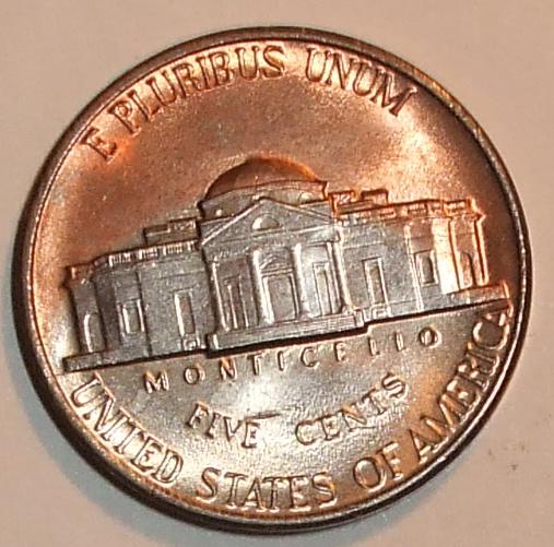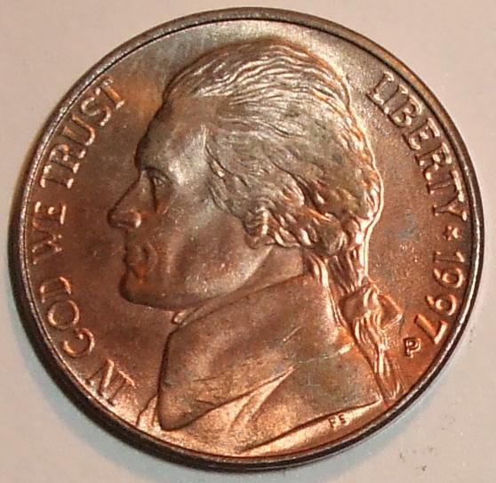 This is a 1997-p sintered Jefferson nickel error. Both the obverse & reverse have a strong and beautiful copper look from the annealing oven. While in the oven this nickel planchet got some of that copper baked into it.