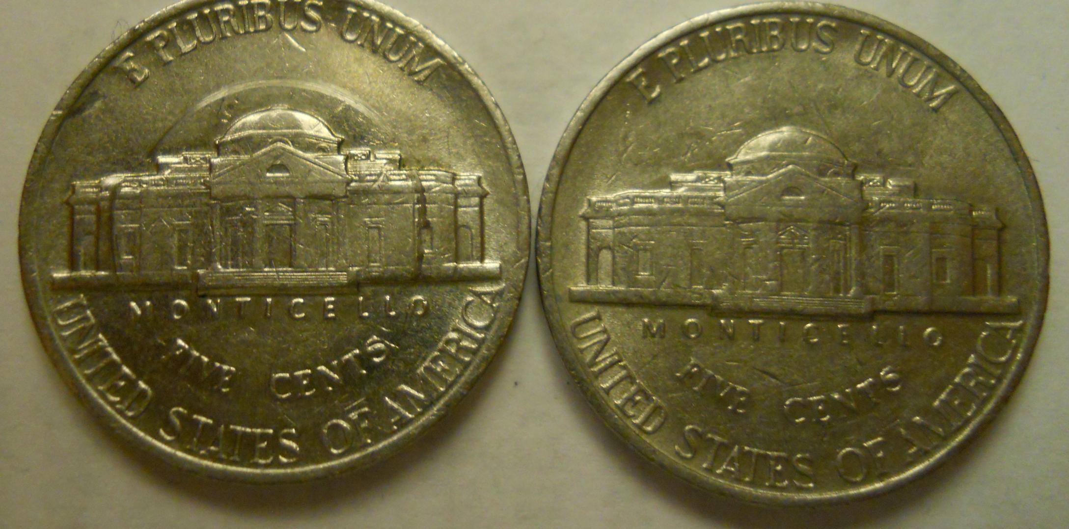 Folks, I'm not sure what, if anything, to make of these coins. Both are Denver mint, one is '95, and the other is '98. There are visible circular dents on the reverse sides of both coins. I've included another '95 nickel for comparison. One can also feel the marks with a fingernail. So, what do you make of these? Some type of striking error? Or simply damage from circulation? Admittedly, I have no idea.