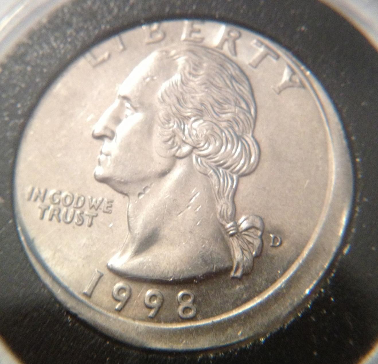 I have a 1998 d quarter the s&t in trust couldn't see them. so it reads in god we tru.the coin looks very strange flattened &wavey sort of coins surface.on reversed side on the left wing of eagle has a round indent &more .does anyone know about the coin.?please let me know.