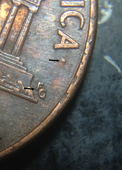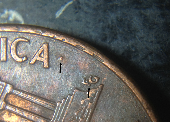 what is going on with the reverse side of this cent? theres a bump and some sort of clash of the letters on the rim and the F in FG is that a DD?