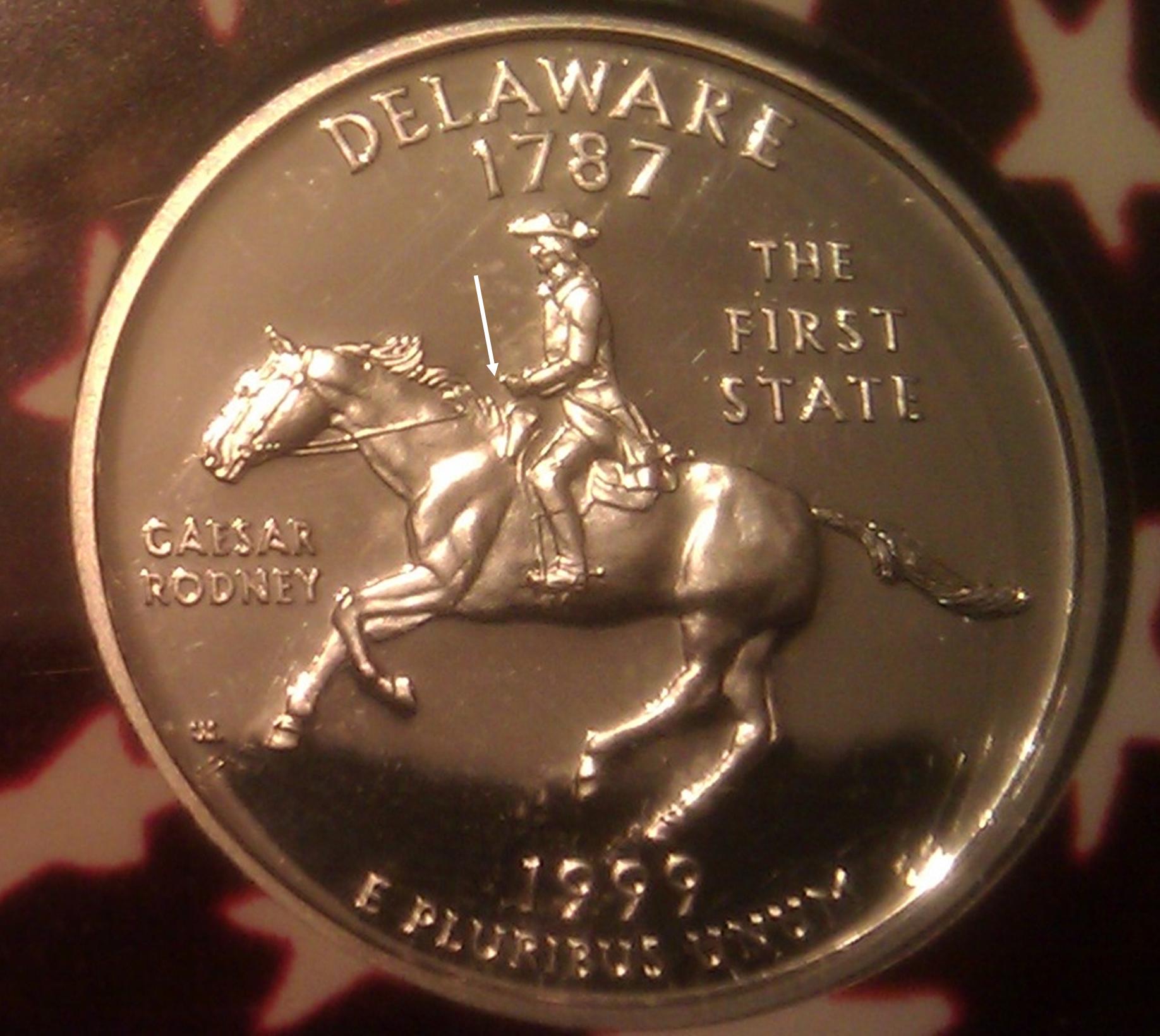 Yesterday I purchased a 1999 Silver Proof Set from a local dealer. When I got home and began looking at the coins, I noticed what I thought was an error on the Delaware quarter. I took it back to the dealer today and he confirms, after looking at other Delaware silver quarters, that it is, indeed, an error. The rein from the bridle in the horses mouth goes across the horses neck and through the mane, but then it stops. It does not go into the riders hand. Has anyone heard of any errors like this? I have tried to take a picture to post, but the coin is obviously still in the plastic US Mint case it came in, and there is a glare on the coin. I've also tried scanning it with similar results. Any ideas on how to photograph it without removing it from the case?