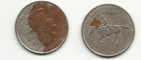 1999 Delaware state quarter error? im trying to find out if this is an error or just some discoloration