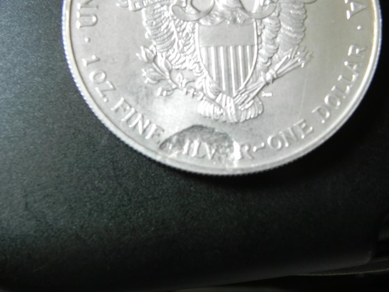 Hello everyone, I am new to this forum and I am fairly new to collecting coins. Anyways, I just got a 1999 Silver Eagle and immediately noticed this "u" shaped gouge on the reverse side over the word silver. However, the letters from the word silver are still present within the gouge so you can still see the word. I attached a pic of this. So the question here is, is the some kind of error at the mint or did something hit this coin at a really high rate of speed and impact? Me being an optimist would say its some kind of minting error. But I could be wrong does anyone have any input on this matter? THX...