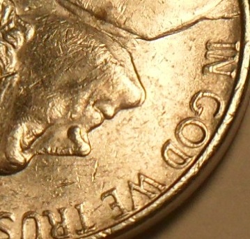 Duane, What leads me to believe that the chin is also machine doubling is because it is directly across from the (obvious) machine doubling on the bottom side of "GOD". You have to understand that machine doubling occurs when the die vibrates rapidly back and forth as it is withdrawing after striking the planchet. Chris