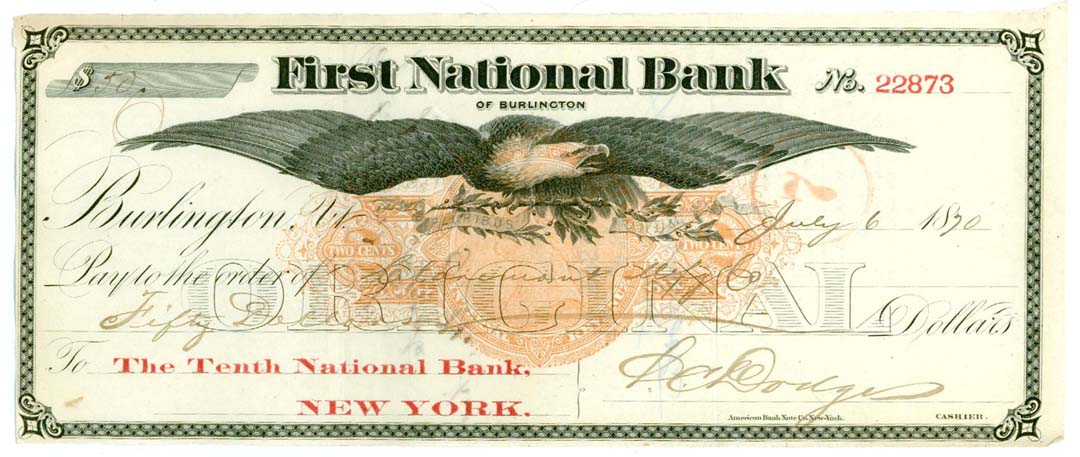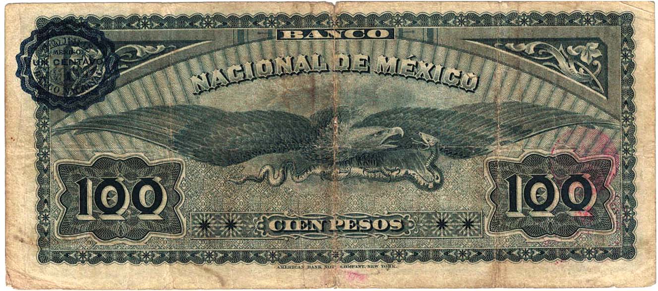 I found an interesting connection to a check I posted way back on page 2 of this thread. The spread eagle was used on many items produced by American Bank Note, from checks to bonds. But today I found a variation on a piece of Mexican currency. The wings and face are essentially the same, but in this instance the head has been darkened and the bald eagle has become a condor fighting a snake. This is from the back of a 1909 National Bank of Mexico 100 peso note. How easily one national symbol becomes another!