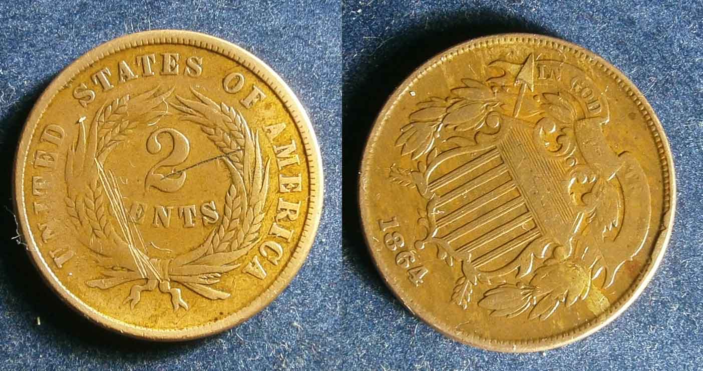 My first 2-cent piece. This is obviously no museum item, but the rotation is curious. If rotated around the vertical axis, then the reverse is rotated about 45 degrees clockwise relative to the obverse. Is this something unusual, or did the mint just not worry about rotation in 1864?