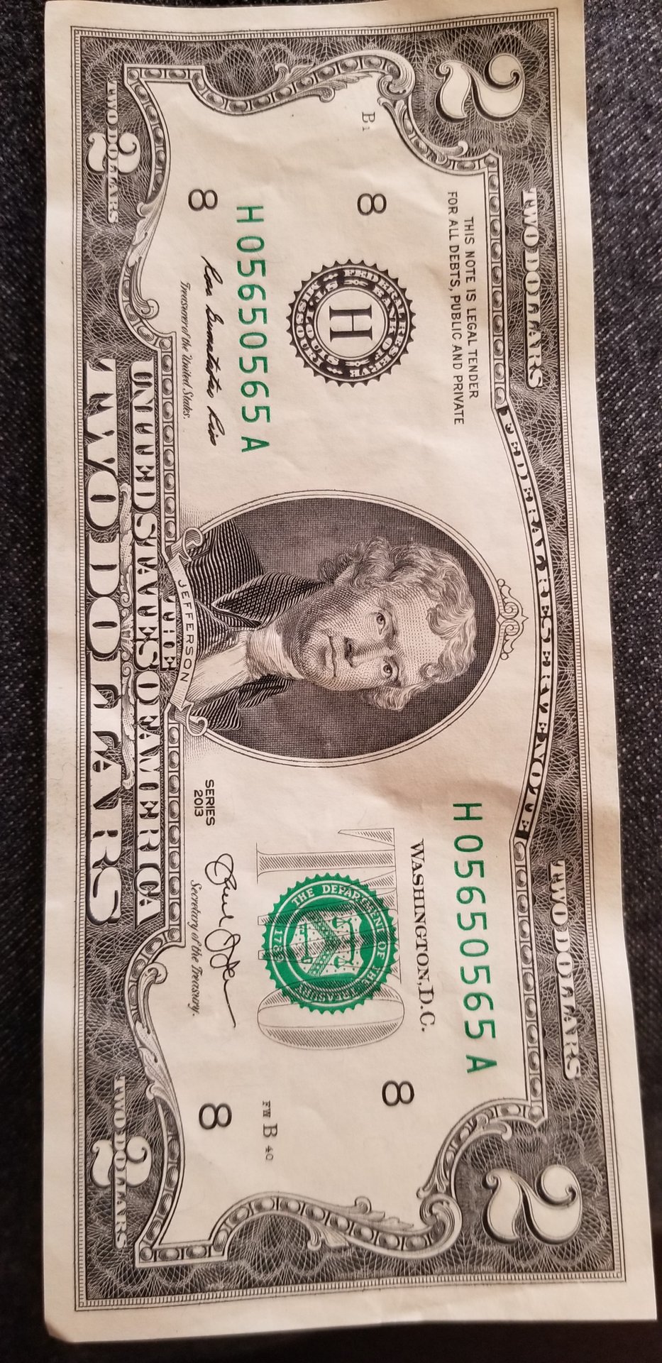Repeating 2 dollar bill serial number