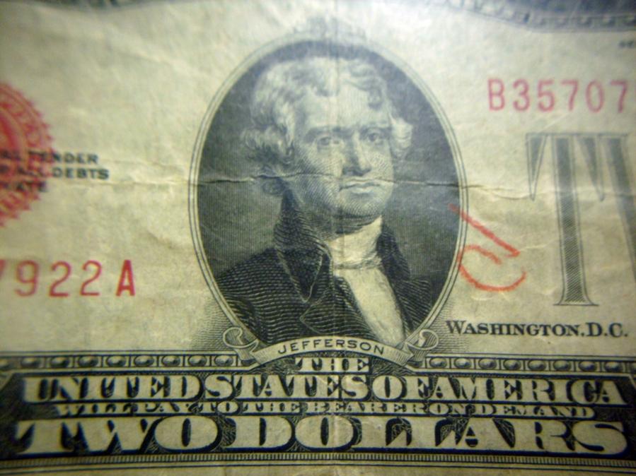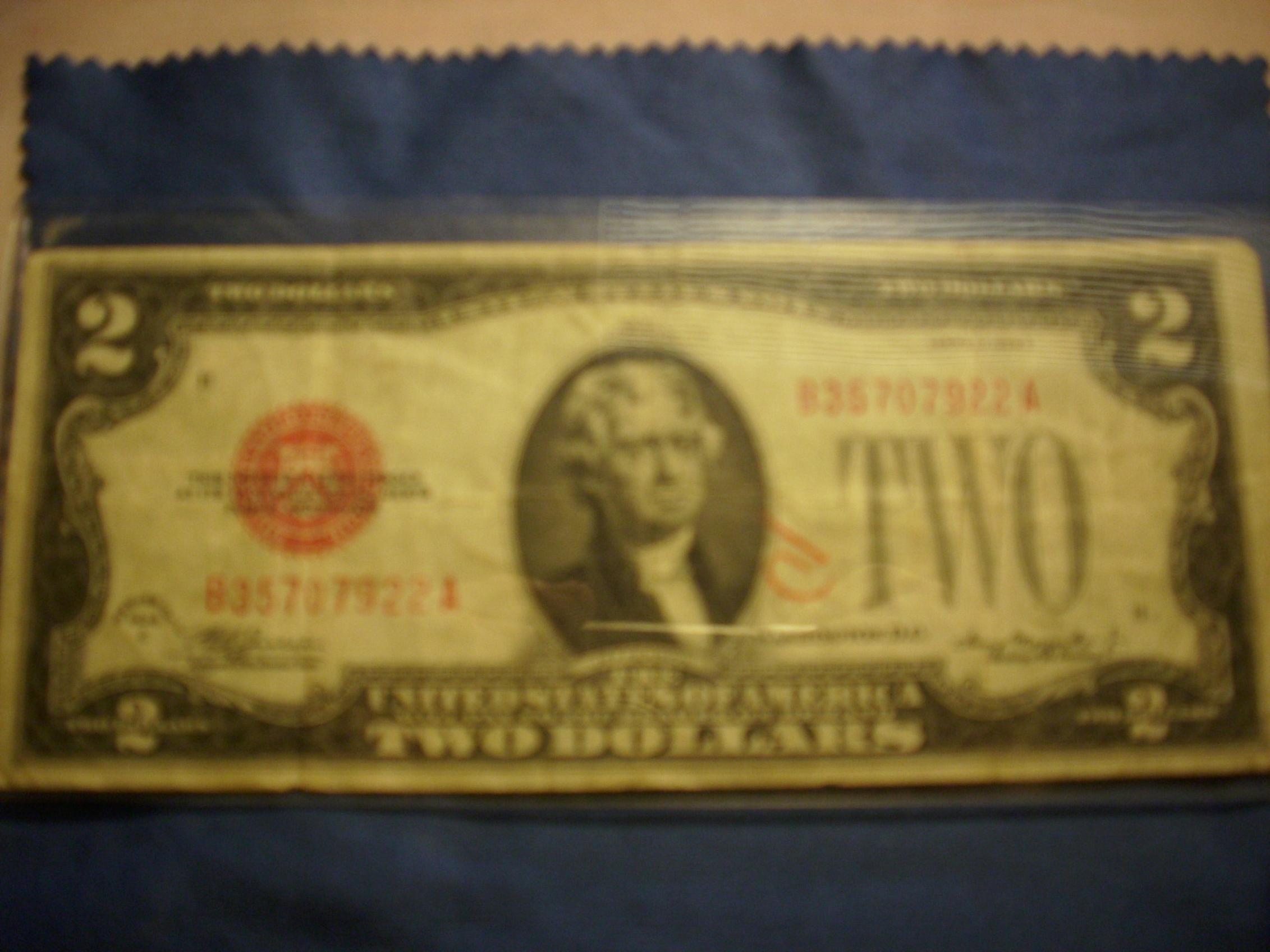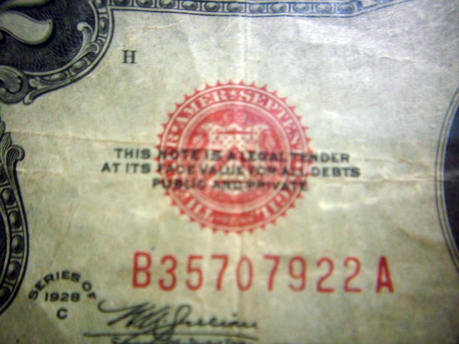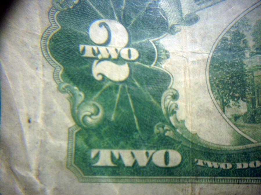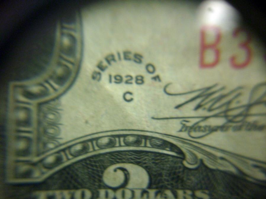 The 1928C $2 note in VF-20 has a book value of $25.00. With the writing in mind, my conservative guess on the grade would be a Choice Fine 15, with a value of $10 to $20.