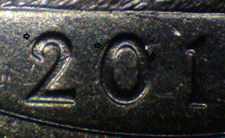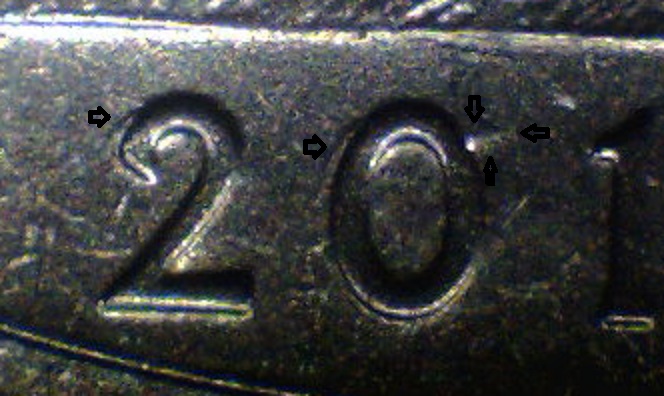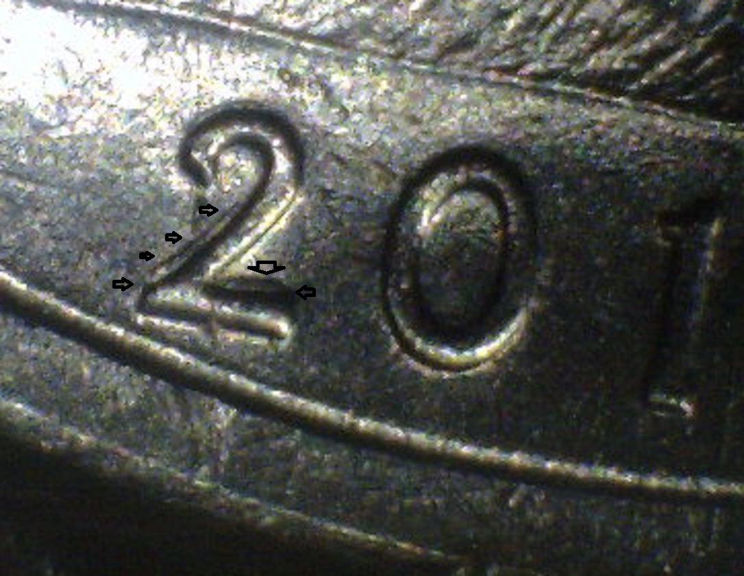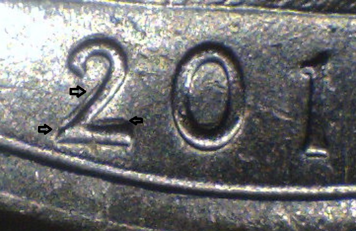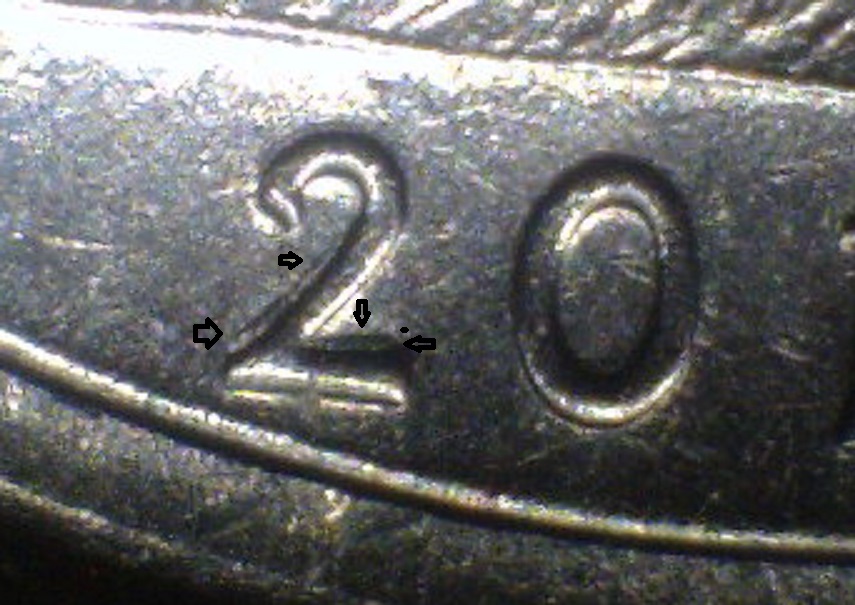 the first 2 pics are of one coin. there looks like a spike on the right of the 0 and maybe something with the 2? the last 3 pics are of the 2nd coin. is the 2 anything? advice appreciated