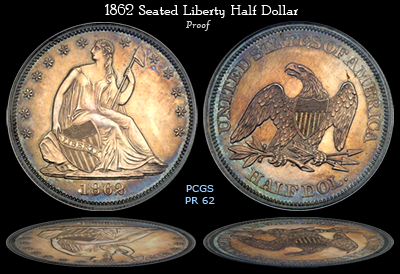 2. Toning that needs a special viewing/lighting angle to pop. An example would be this 1862 Proof Seated Liberty Half, which looks more "normal" with the typical reflective silvery proof surface, until you hit that special lighting/viewing angle where the color and toning pattern appear.