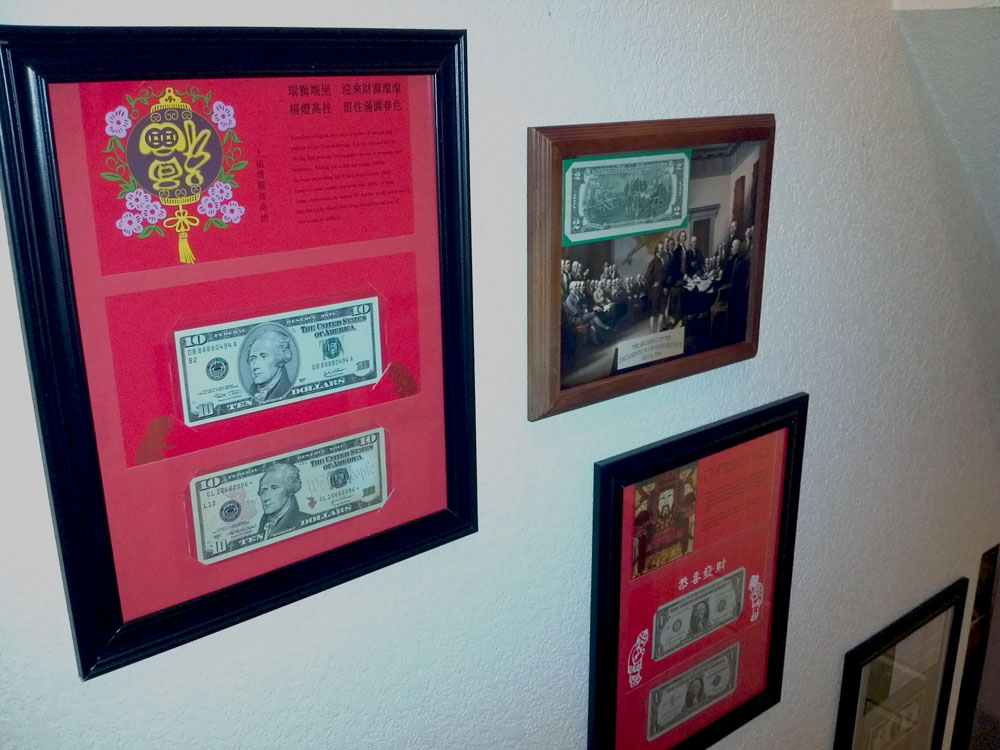 Here is my idea of money art! I actually put some time in framing these, and making the cutouts. What the original artist did was not unique! You can google a thousand photo's of stacked notes? Even Warhol would of painted a unique day glow can of soup on the notes? Mine is a statement of a left brainer in action. BTW: I have these doted all over the house The wife loves them, even though I bad mouth the Federal Reserve Banking System all the time...