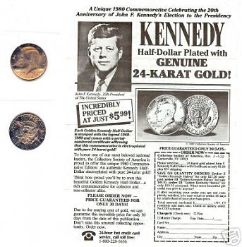 Thousands of coins are plated and sold to the public for whatever reasons and some may or may not actually commemorate some event. As for your particular coin, I've seen these before but never with gold plating. From a numismatic standpoint, they are collectible but only from an exonumia standpoint as Chris pointed out, it's considered damaged from a "coin collecting" standpoint. Now, if you remember for sure that you've seen a newspaper add for these, perhaps your best bet in locating that add might be to start looking for newspapers from 1980? Maybe research your local paper's archives with a visit to their headquarters? Other than that, I can't think of any other method of locating such an ad.