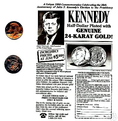 Hi again folks, I found this 20 year commemorative Kennedy while roll searching, The pics do not do it justice it a beauty. 2 Questions #1 why did this coin not get gold plated like all the rest? #2 does anyone have the news paper insert that I can copy off to put with this coin? I know its nothing special but is it Chrome plated? Silver Plated? Did it get the Nickle and not the gold What gives? THANKS NEWBIE HERE JON