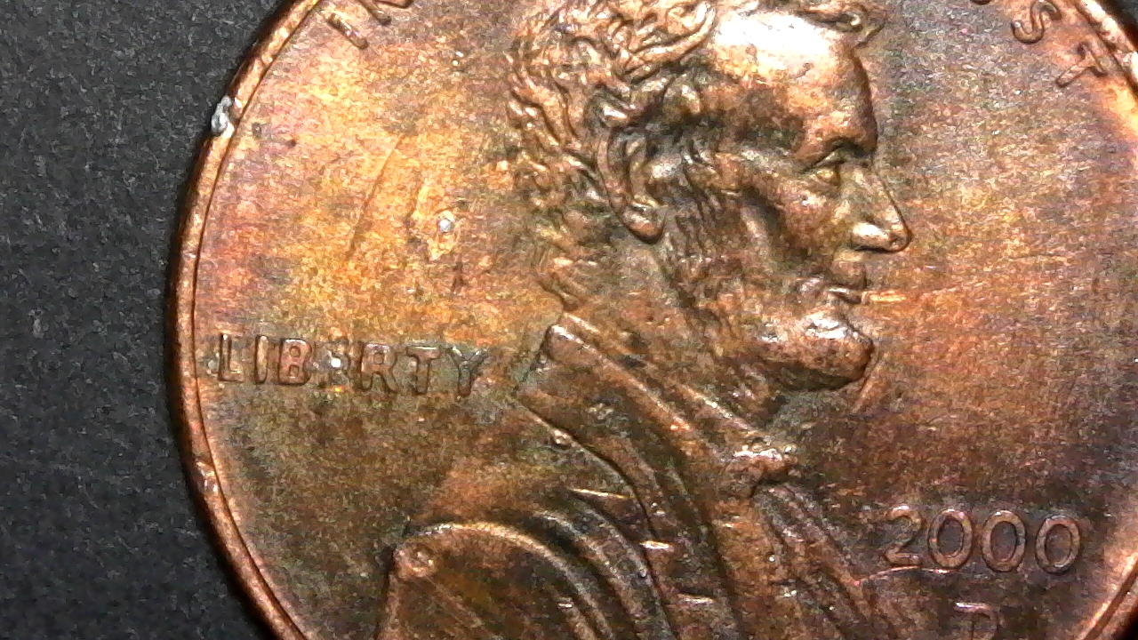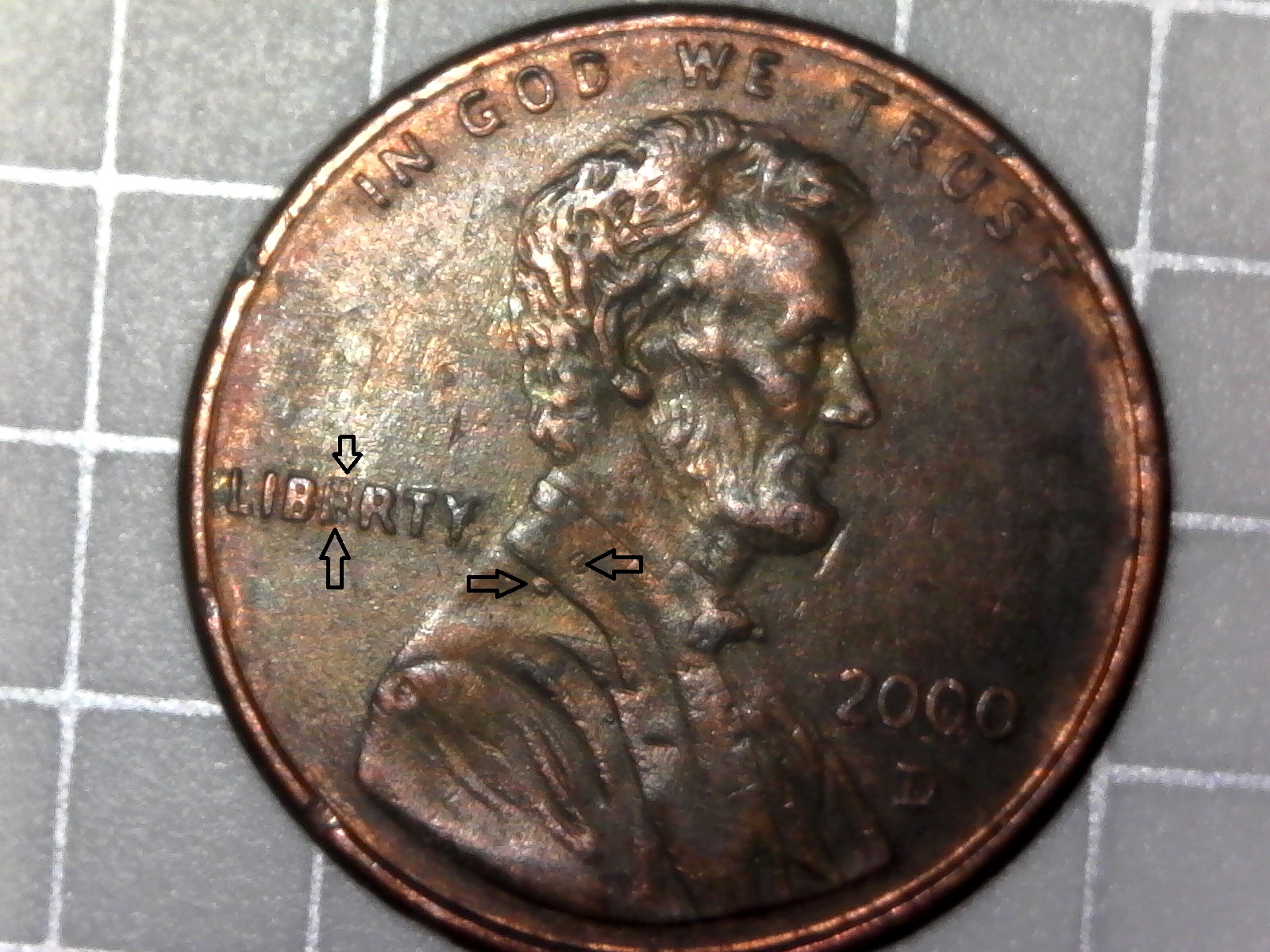 Pocket change founded this Lincoln Coin 2000 D under my observation I founded perhaps some errors on Abe color . It seems to me like nail goes through his color of his coat. Arrows pointing the ends of perhaps something. And Liberty the letter E is somehow erasing. What do you ?