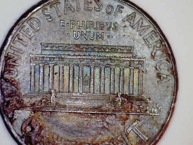 i agree on PMD, see those bumps in your pics, those are plating blisters and/or bubbles, an indication the coin is copper plated, the discoloration could be from most anything, some sort of chemical reaction maybe...