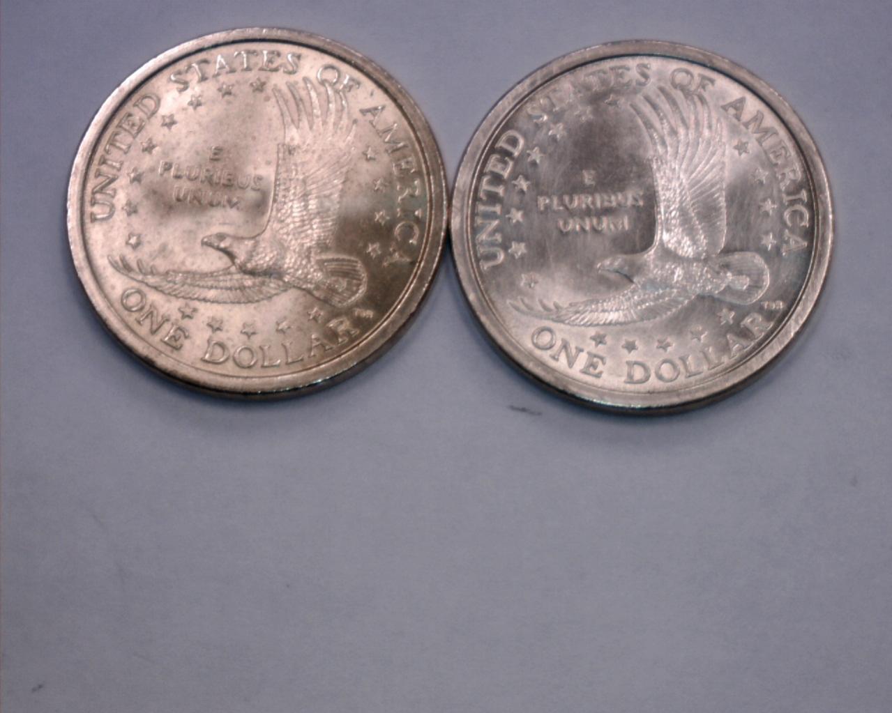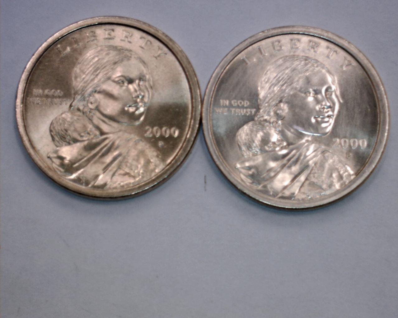 Hey guys i just noticed this 2000-P Sacajawea dollar coin and it looks much more silvery in color compared to the other 2000-P goldish looking coin i have. Could it be missing some kind of layer? Thanks The pictures do not display the full silver color it has on it and it is mirror like. It is the one on the right.
