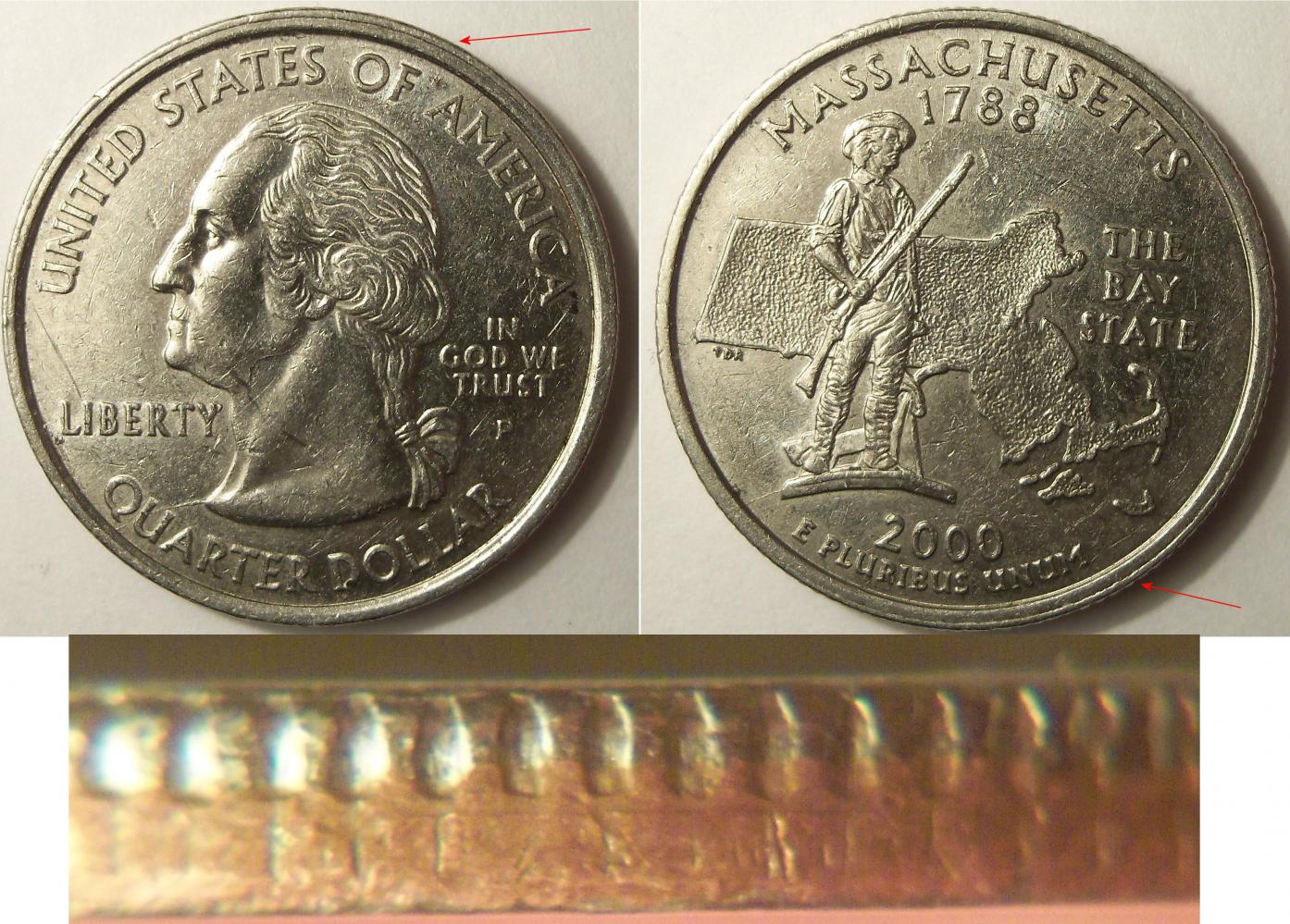 just re-checked the measurements on the nickel struck section it measures 24.26mm (as a regular quarter does) and on the copper unstruck section it measures 24.30mm so it has mushroomed out at the unstruck portion of the edge.