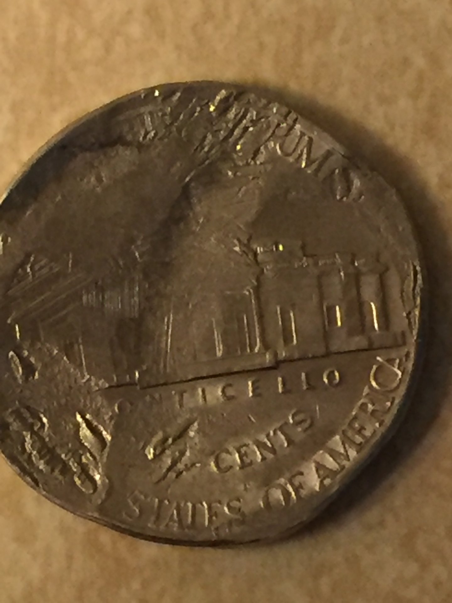 I’ve study this nickel for about a week and a half! I have even tried to see if it was done with a hammer or other tools and nothing came out anything near this coin! Any thoughts on what could have caused this! The left side on the reverse of the building looks more like the center of the building but crooked! Interesting if anything!