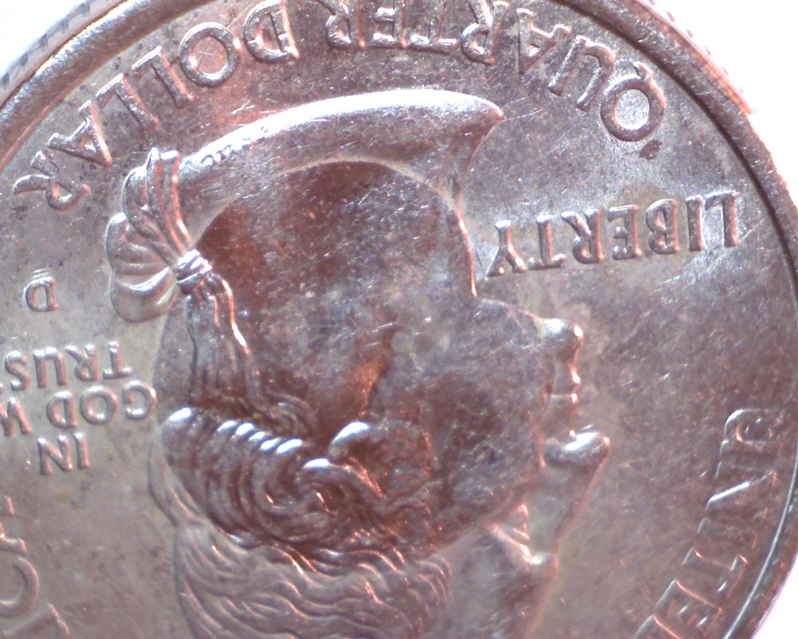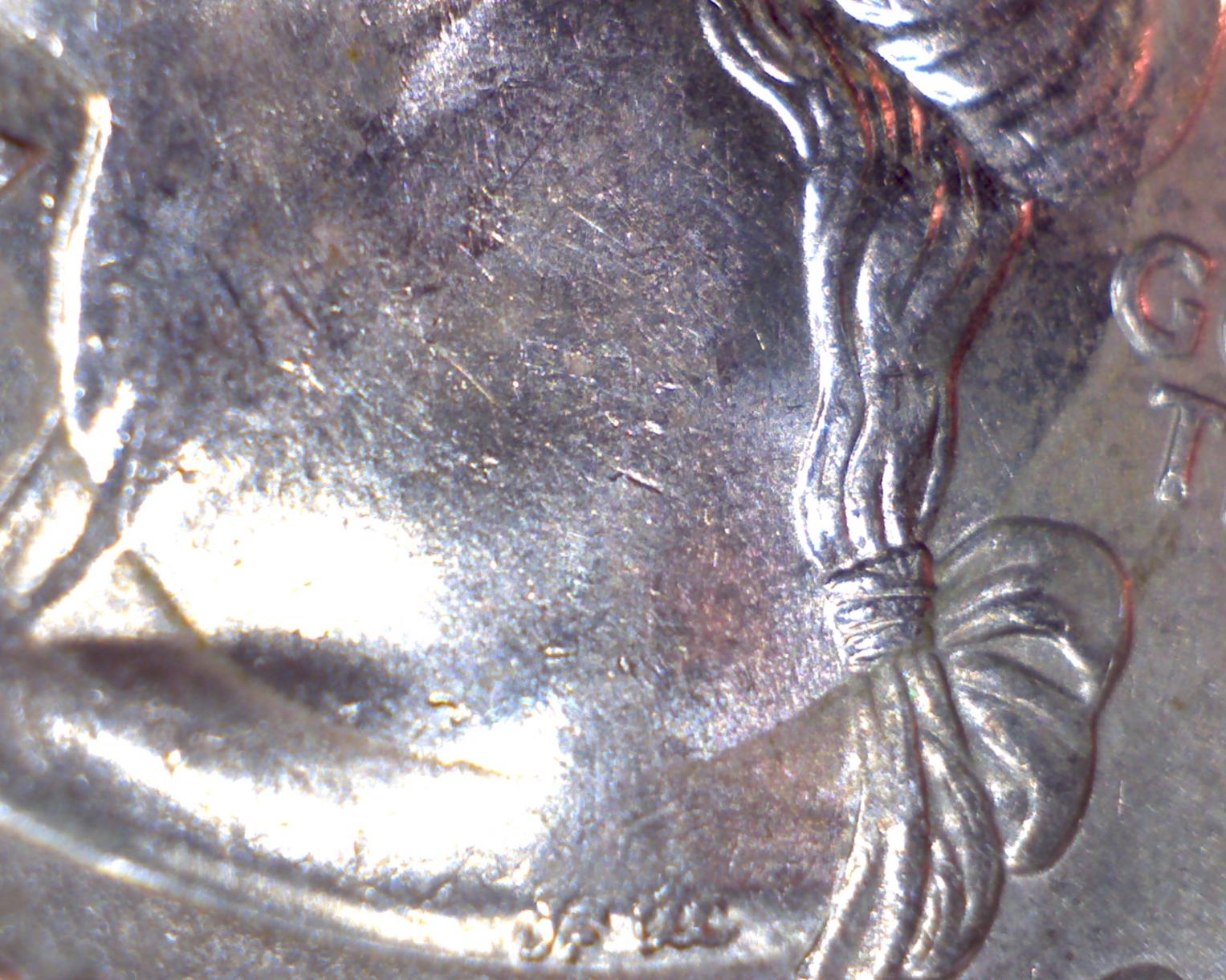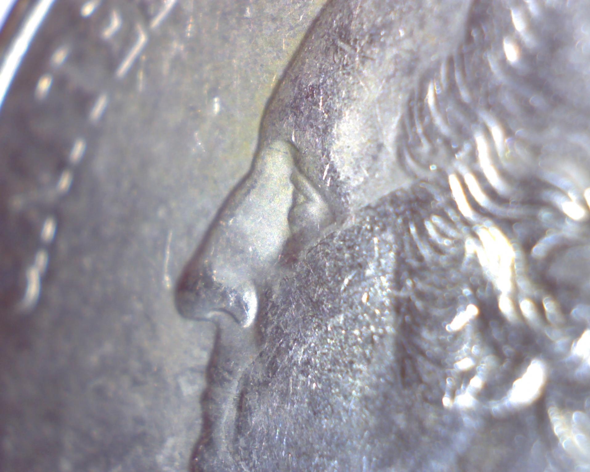 It almost looks like a circular impression. If there is no depth to it, then I agree with adhesive. If there is some depth, then it's something circular pressed onto the coin (post mint).