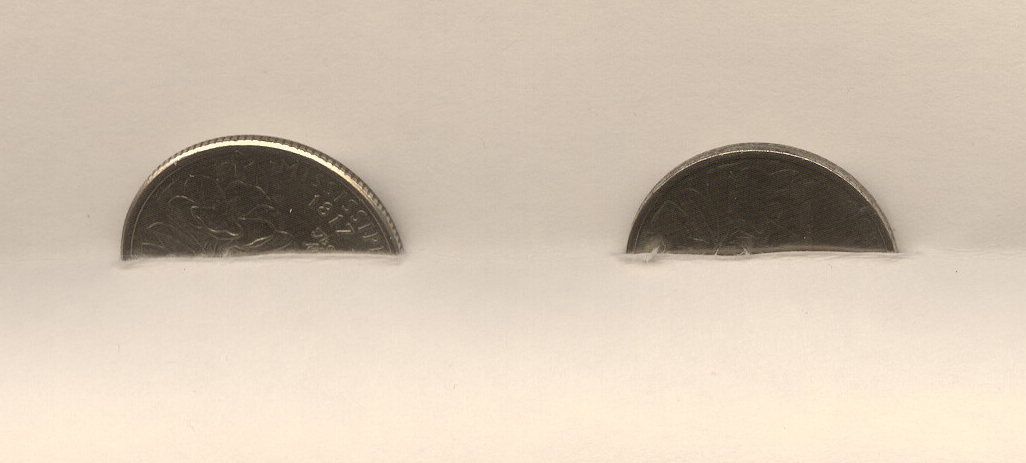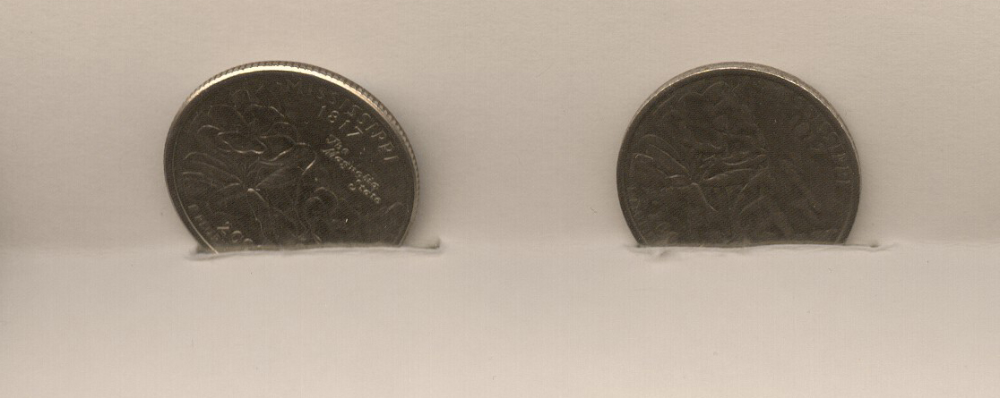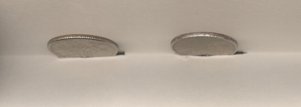 Hello all, My name is Travis and one day when I was trying to buy a drink from a machine it would not take my quarter. Upon examining it I noticed it was very different from other new quarters made in that year. I am NOT a coin collector so I don't know much about them but I play poker on the weekends and one of the guys there knows about coins. He told me the coin I have does not have any value but then he went on to say he likes to collect odd things and he would pay me $20.00 for this quarter. This made me toss up a red flag and hold on to it and try to find out more information about it. I want to know if it does have a value or just some kind of messed up coin. I've made some scans of it but my scanner is not the best of them so I will list what I see with the coin. I have no clue as to what I'm looking at so any help on this would be greatly appreciated. I have 5 Pics Q1 is the face you can see how the letters are bigger and not as detailed. Q2 is the back and it's much like the face. Q3 is the edge and you can see how it does not have slits in it. Q4 is a different angle to see the slits are not there and the border it thick. Q5 is a side view that shows how messed up the side looks. Also the messed up quarter is a tad smaller then the other one.