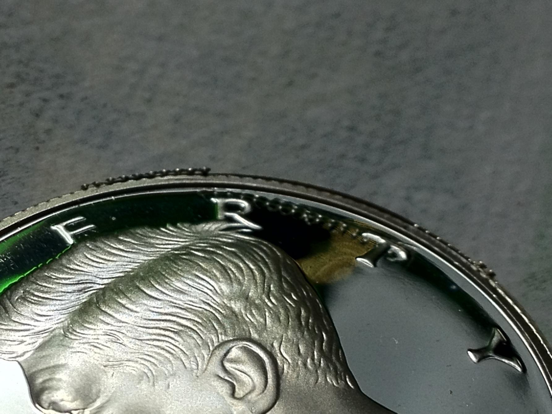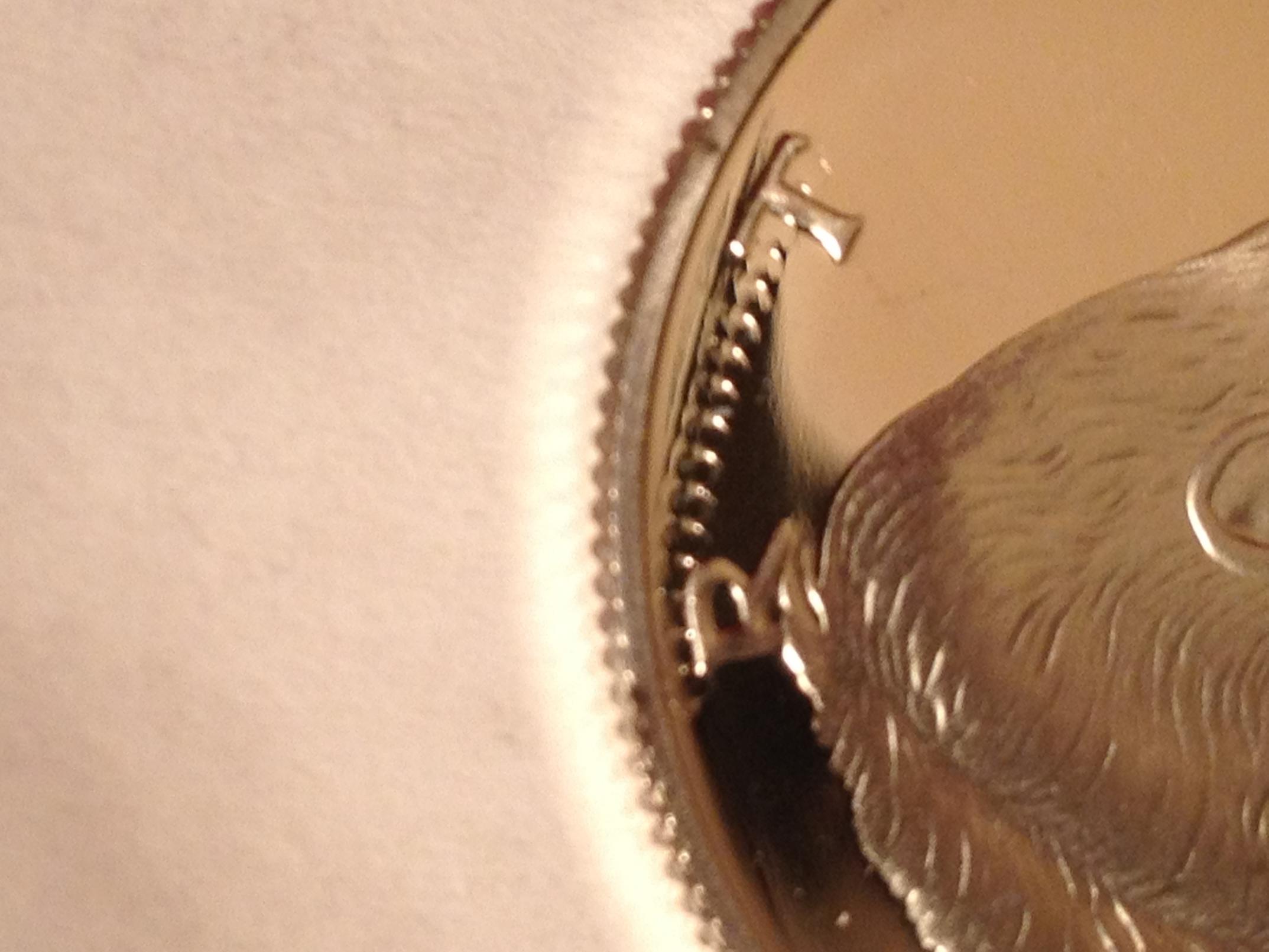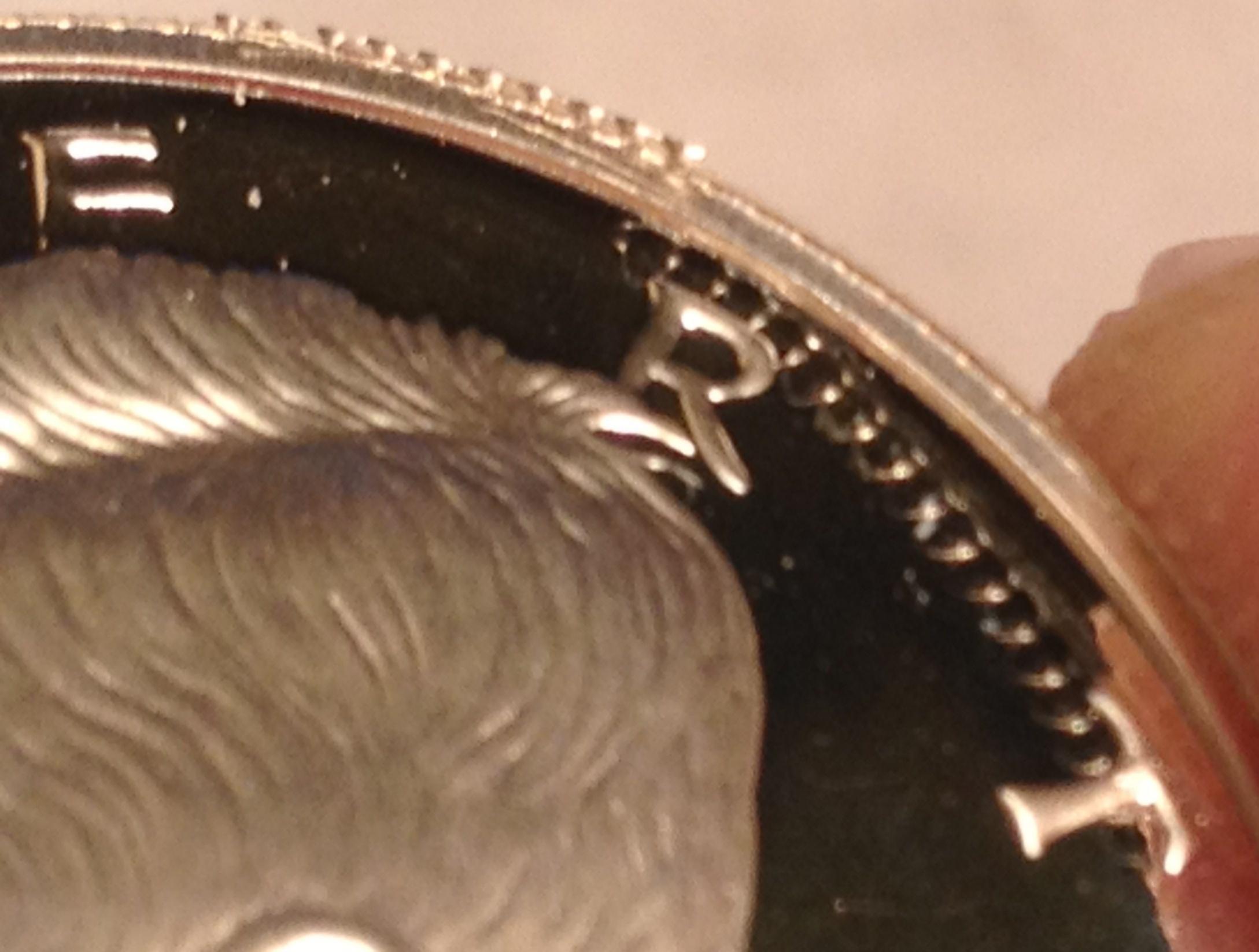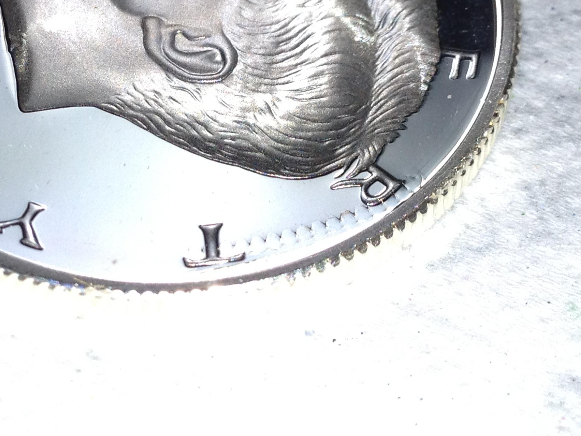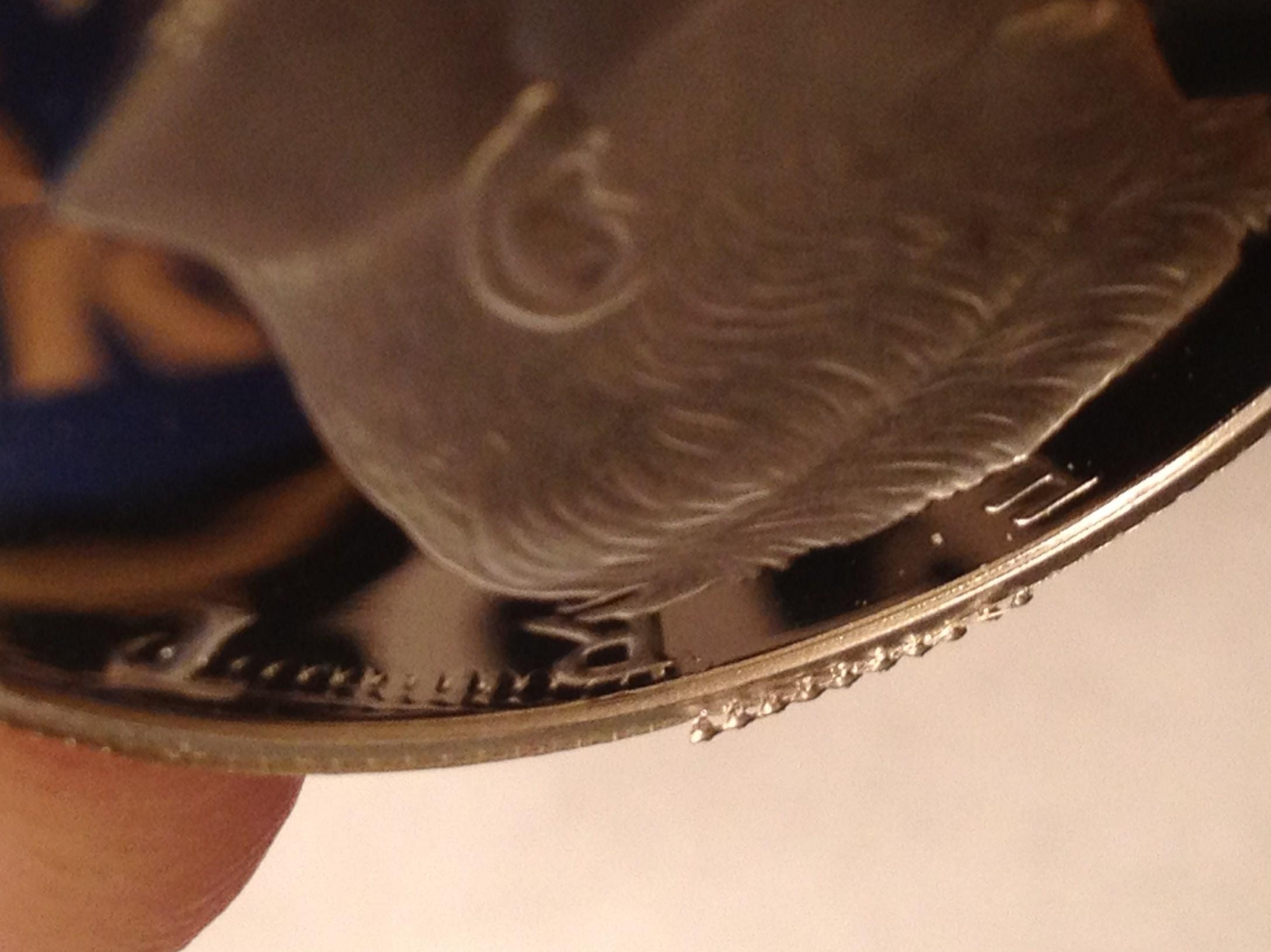 PMD from what? This Coin was in the Mint lens until a few hours ago. What it appears to me is that some of that extra reeding (if that is the proper term) was struck into it. There is still some of this excess on the rim of the coin sticking up between the E and R in Liberty. Also that "thumb print" is the reflection of the desk lamp I'm trying to use as lighting mixed with the digital noise of the camera zoom.