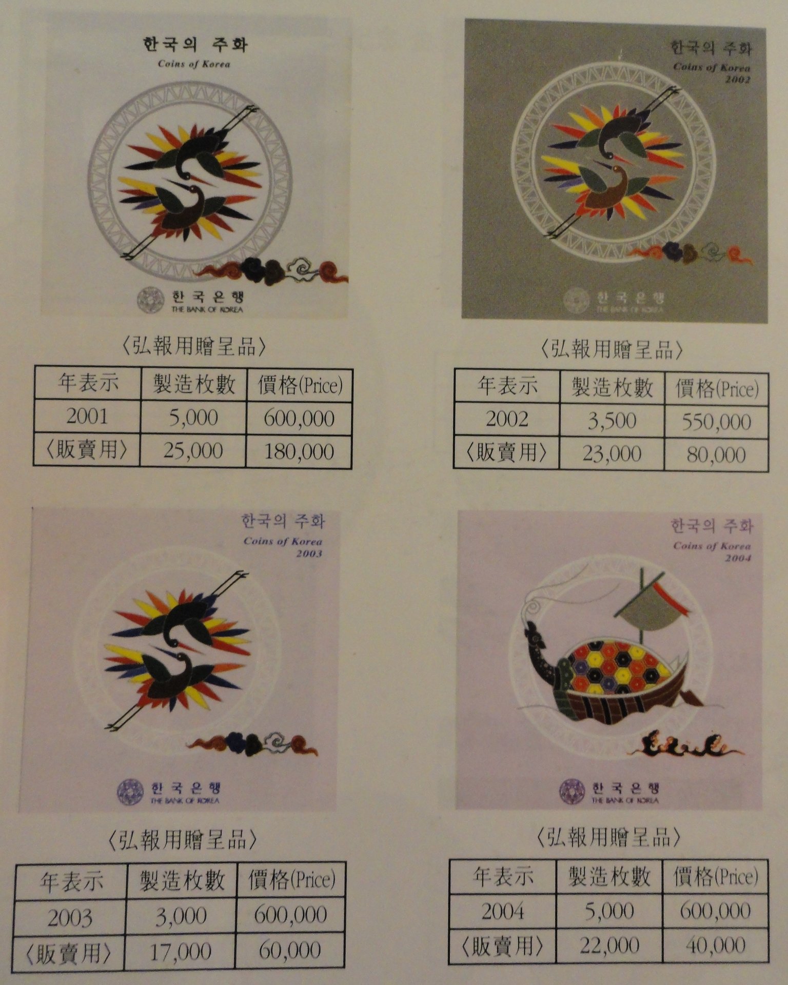 When it comes to World Coin mint sets, don't look at Krause. They really do not have the best information on mint sets. You'll want to have a Daegwangsa or O-sung K&C catalogue (Korean-published). At least with these, you can see all S. Korean mint sets ever made. There are many more than Krause cites. And the last time I looked, I thought Krause cited ones that don't even exist(!) That 2003 Bank of Korea "proof set" that you linked from eBay number only 3,000 sets made. They made 17,000 "regular" sets for 2003. The background is this: The Bank of Korea made special, "foreign" mint sets ( 해외증정용 민트세트 ) from the years 2001 to 2014. These were meant to be given as gifts to visiting foreign minting agency workers who toured Bank of Korea facilities in South Korea. These "foreign sets" are identical in appearance to the regular, yearly mints sets, with the exception that all of the titles and lettering are in English only. Very little or no Korean hangul alphabet appears on the "foreign" sets' cases or slipcovers. If you see one of these for sale/bid outside of Korea, they will often be sold at the regular set prices, as the sellers occasionally do not know that what they are selling is actually special. While tens of thousands of the regular sets were made each year, for the years 2001 to 2014, only 3,000 to 5,000 "Foreign Sets" were made depending on the year. These, of course will sell for twice or three times the price of a regular set, IF the seller knows what she's selling! The six coins in the "Foreign" sets for the years 2001 to 2004 were minted in reverse proof (or "matte proof" ...or was it "satin proof?"), and have been selling (from my rough estimates) in the collector market for at least $250 to $700 USD over the past few years. Notice the difference in the appearance of the coins below. Regular BOK Mint Set for 2001 (left).... "Foreign" BOK set for 2003 (right).... Here are the four mint sets that were made as "reverse proofs" (foreign mint sets): The mintages are on the left of the chart, (foreign mintage on top left, regular mintage bottom left), and the catalogue prices for these on the right. Like most catalogues, the Korean catalogues quote rather sanguine prices...