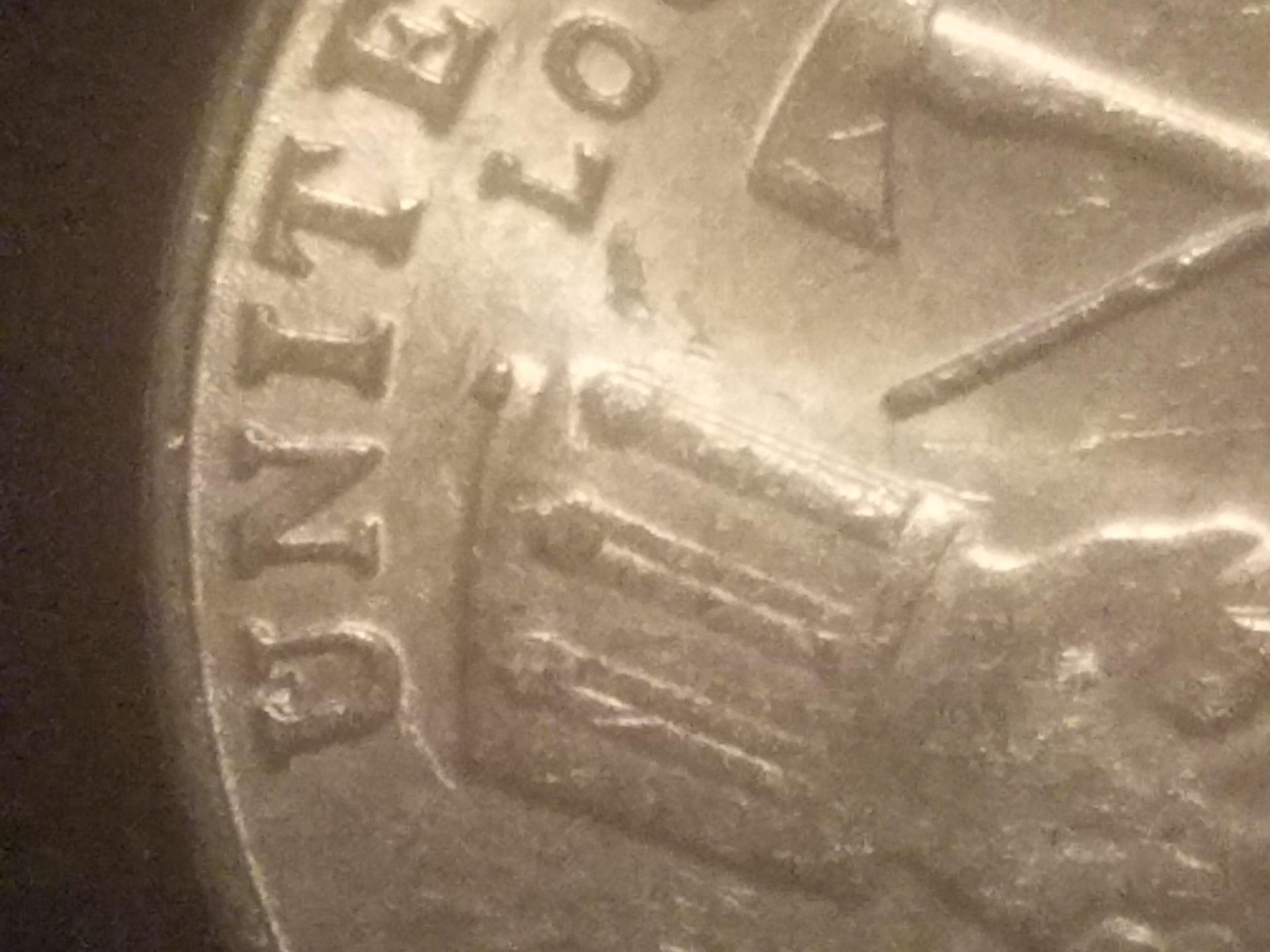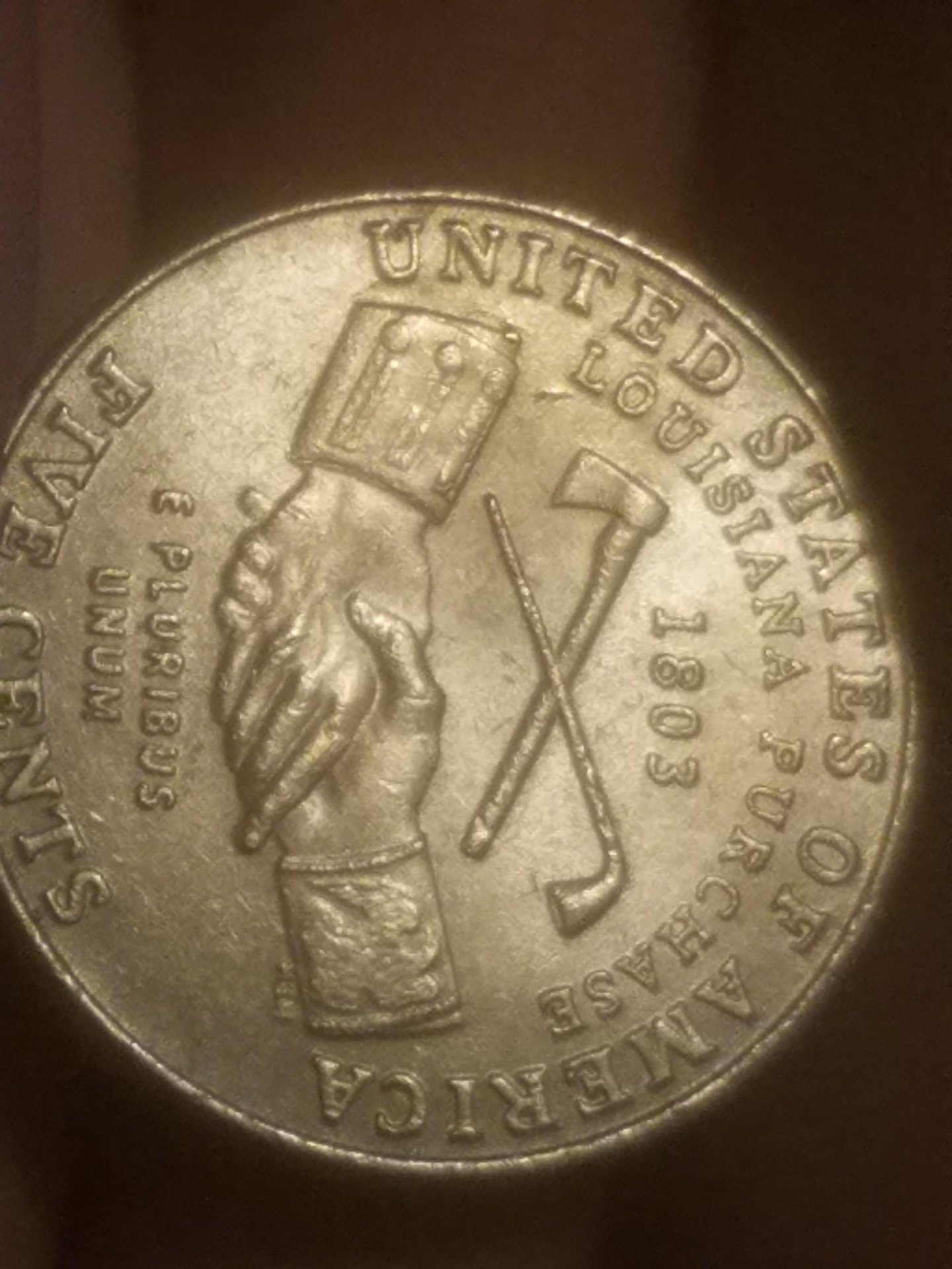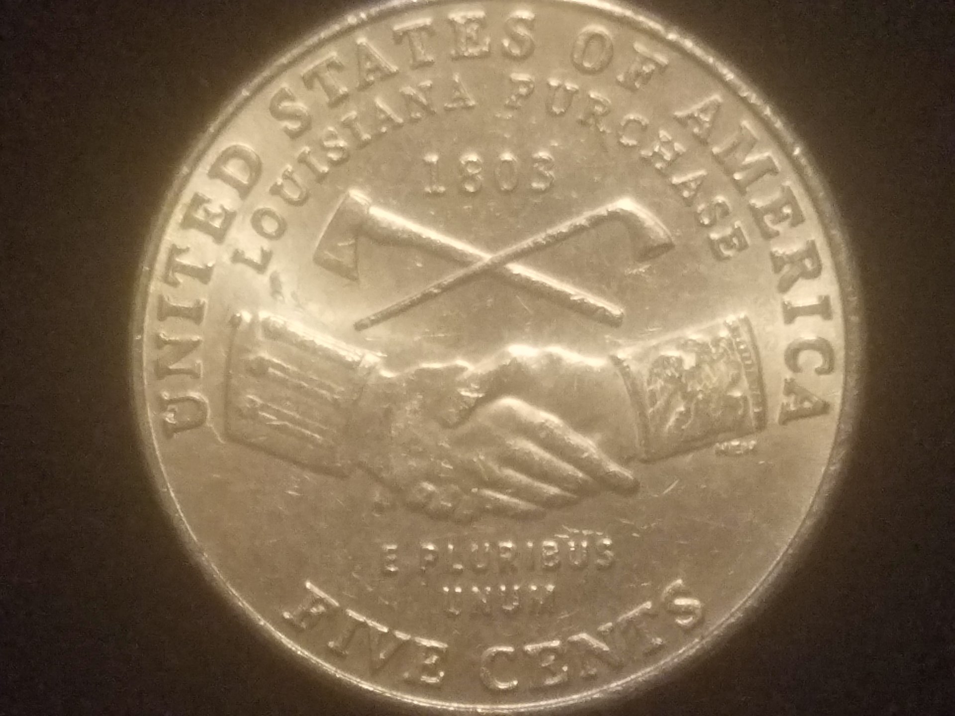 I'm still pretty new so if I misuse a term feel free to correct me. I came across this 2004 Louisiana purchase nickel and seen that it has a cud on the left sleeve at the top. There is also a die crack in between the u in united. Let me know what you think...