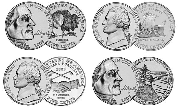 Buffalo nickels were from 1913-1938. In 2004-2005 there were the Westward Journey Nickels. In commemoration of the bicentennials of the Louisiana Purchase and the Lewis and Clark expedition. 2004 “Louisiana Purchase/Peace Medal” Nickel 2004 “Keelboat” Nickel 2005 “American Bison” Nickel 2005 “Ocean in View” Nickel