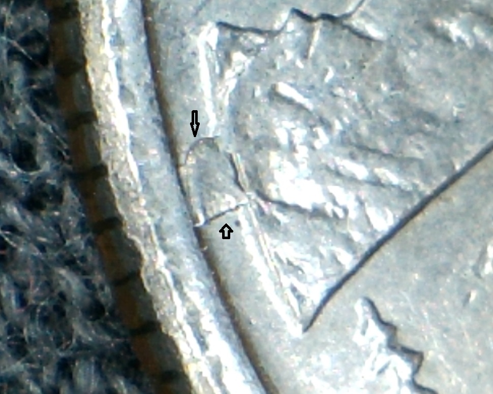 It looks like a die break to me. A cud is a break that forms on the rim and extends into the field. Chris