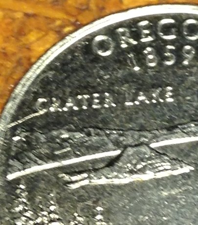 I found this 2005 Oregon quarter that appears to have a scratch going from the C in Crater to the edge of the reverse. I was wondering if this was a scratch or something else?