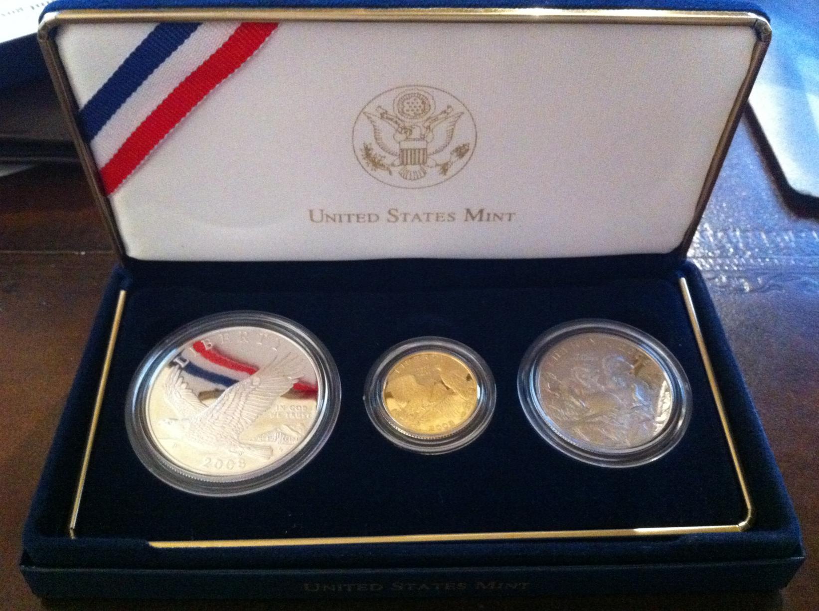 I am selling my 2008 Bald Eagle Commemorative 3-Coin Proof set including the $5 Gold, $1 Silver and Clad Half. This truly is a beautiful set, and only 25,000 sets were made. I'm asking $520 for the set shipped, figuring $470 for the gold, $40 for the silver and $10 for the half. This is a great opportunity to buy some beautiful coins at near bullion prices. The picture attached is the actual set you will receive. Please PM or reply if you are interested. Thanks!
