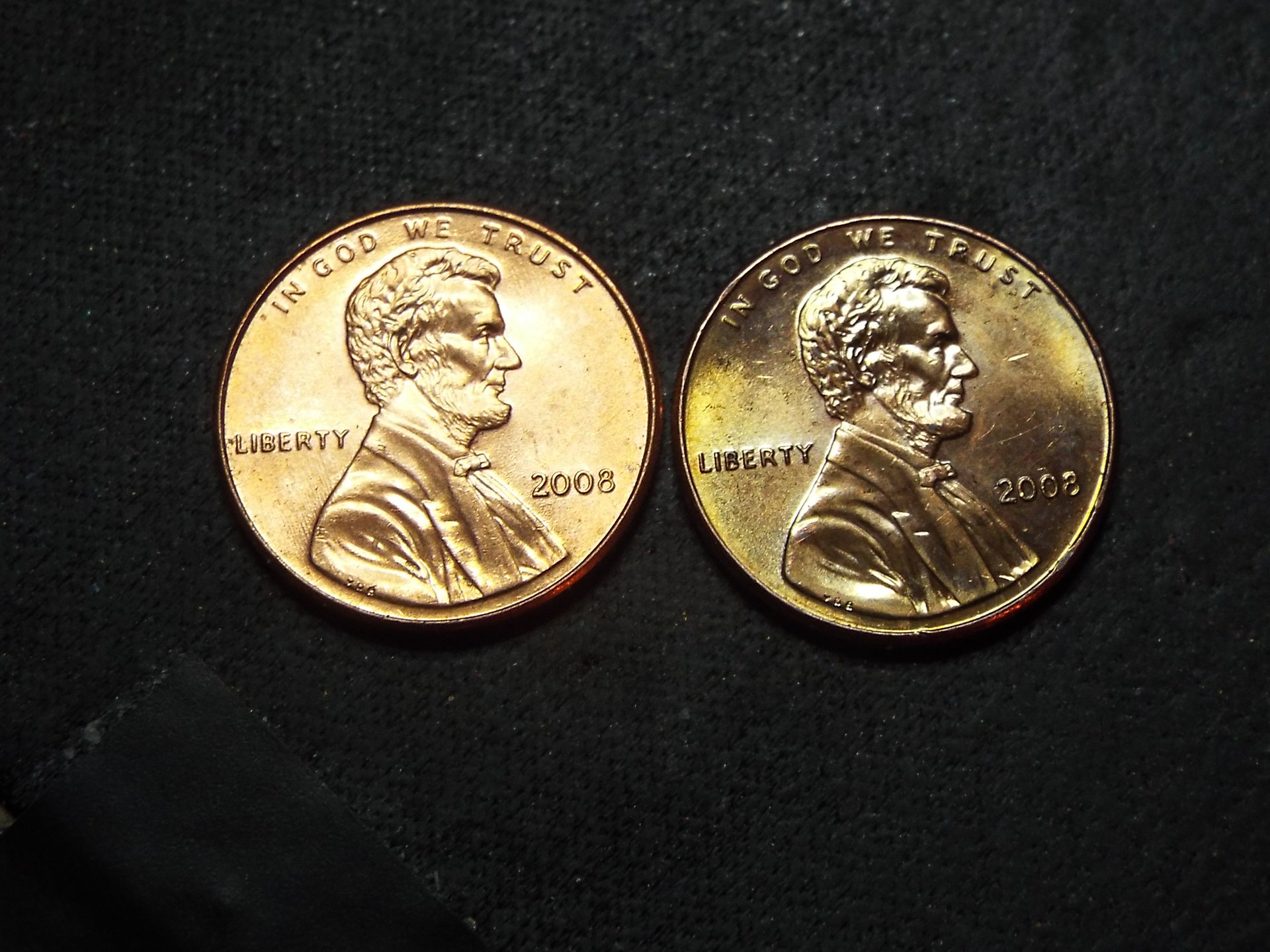 Hello, I noticed a penny after opening a roll and dumping them into a bowl to look them over, and immediately one of them stood out, it was different than the rest of them in color or finish. It's a 2008-P Lincoln Cent. I found some more from 2008 but this one was different, I took a couple of pictures to show you guys, and would appreciate it if someone can explain why this is appears "paler" than the others. Did they mint pennies with different finishes, or of different alloys in 2008? Thanks for any help, I hope the pictures are sufficient to see what I mean. The one I'm talking about is on the right side in both pictures.