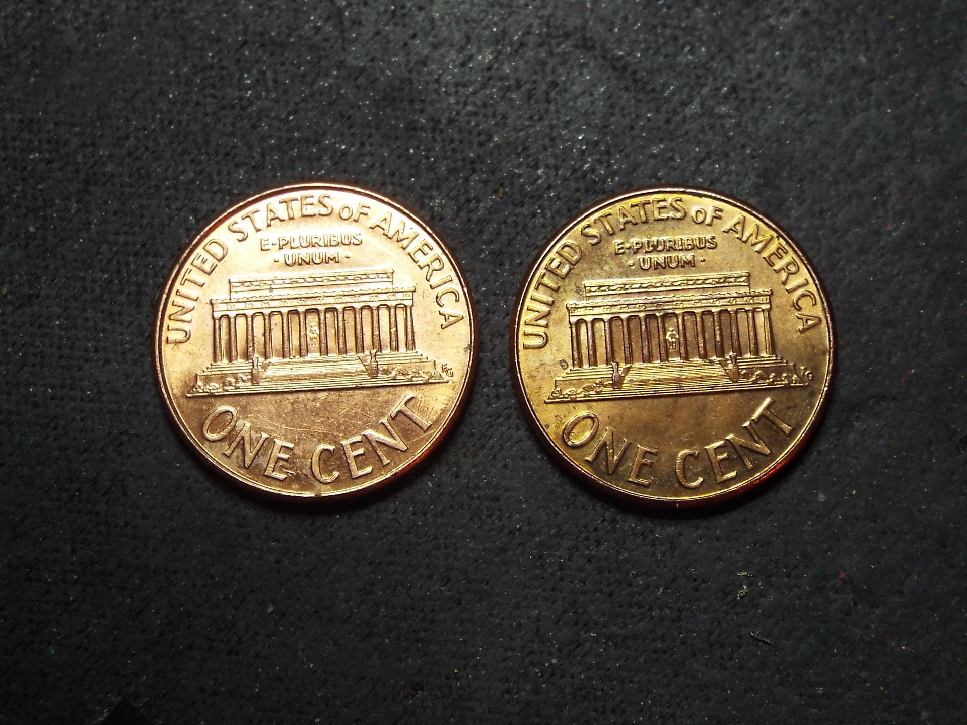 Sometime over the past 7 years, the coin on the right was exposed to an environment that the coin on the left was not. The copper reacted to this environment by changing color slightly.
