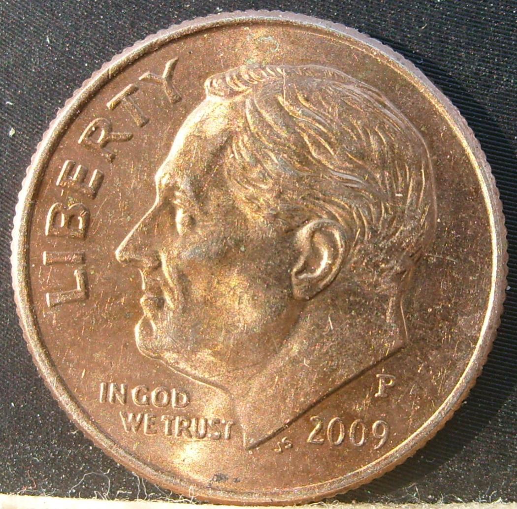 The 2009-P dime appears to have been struck on an improperly annealed planchet. Excessive heat, prolonged exposure to heat, or excessive oxygen in the normally oxygen-depleted environment of the annealing oven causes copper and nickel atoms in the clad layer to migrate and segregate out into relatively uniform layers. Copper tends to migrate toward the surface.