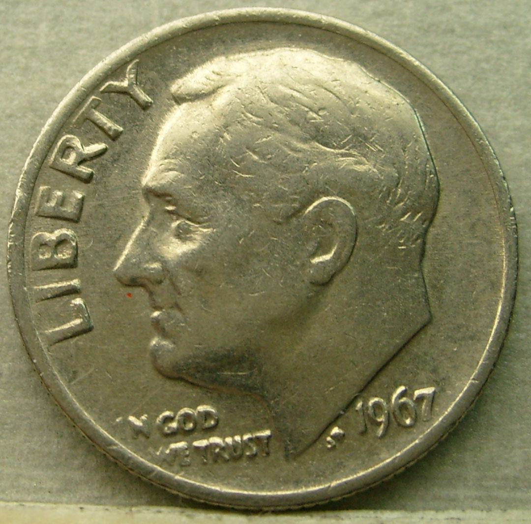 Just yesterday checking a roll from the bank, I found this dime with different color than the regulars. The 1967 dime and the 2009 cent are here for reference only. Thank a lot for your help.
