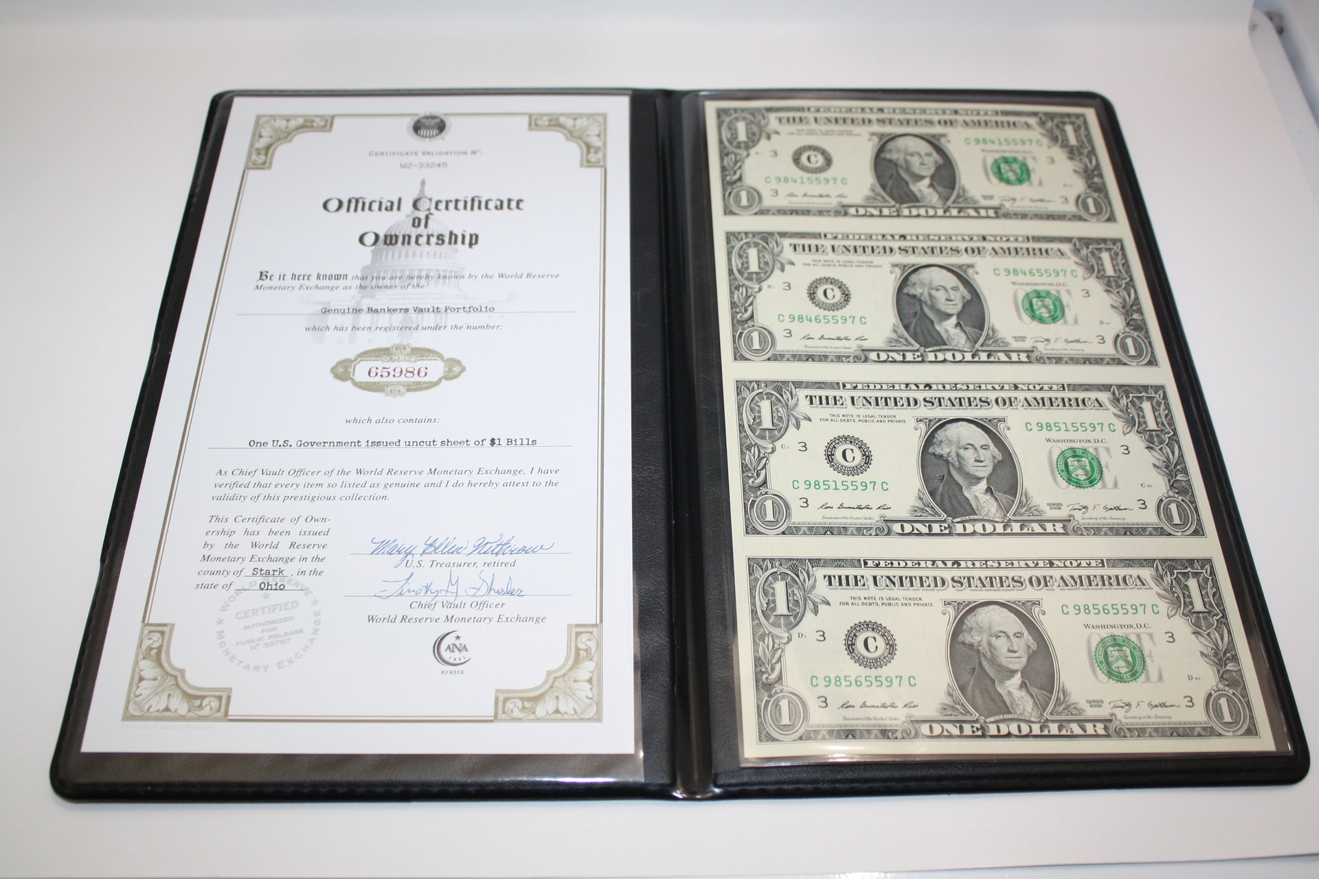 The vast majority of modern 4-subject sheets have minimal value over face. With being said, star sheets and sheets with fancy serial numbers are the exception. All of the denominations are currently available through the Money Factory store at the BEP, and the one dollar sheets are now 5-subject instead of 4 because of the new 50-subject full sheets. The World Reserve Monetary Exchange bought sheets from the BEP, repackaged them with certificates of authenticity and resold them at a premium.