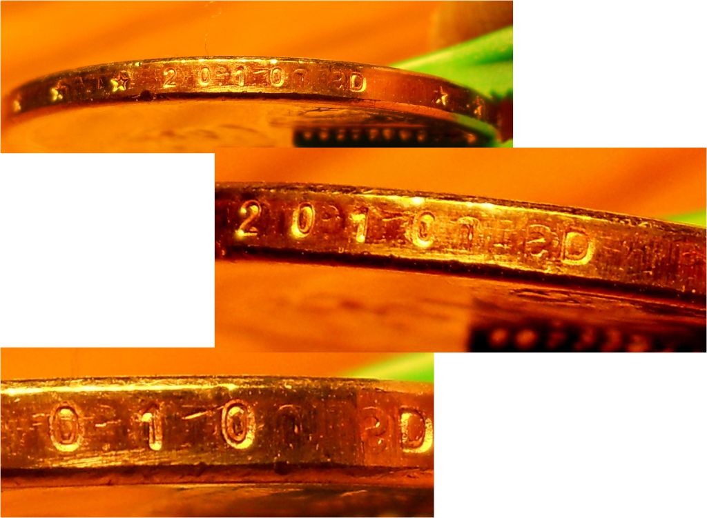 It seems to me that the article fortifies the "some experts thinks this is where the coins bang together" theory except that the "banging" is occuring in the edge lettering machine. As for trying to do this "banging" on your own, it's very difficult since the primary ingredient is missing. That ingredient is heat since the coins are annealed prior to minting to "soften" the receiving blanks for the coin image. The minting process itself generates heat so these coins are quite hot while being minted and while receiving the edge lettering. I think I banged my thumb with a hammer trying to smack two of these coins together to get an extra letter to show up. At any rate, these extra letters, which are in relief instead of incuse (as the actual lettering is) on the edges are the end result of two coins coming together somewhere in the minting process. Whether its the Schuler Edge Lettering machine or the bagging operation is unimportant IMO as neither situation actually creates a variety. A COOL coin yes, but a variety no. Many have been bought and sold for this unusual characteristic due to not knowing what it is but I doubt that any real premium should be associated with it. Remember folks, edge lettering is not new by any means and was used on early american coinage such as Flowing Hari, Draped Bust and Capped Bust Half Dollars. The edge lettering errors we see today on the golden dollars existed on those coins as well.