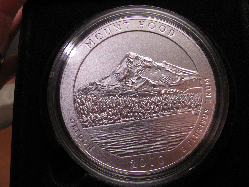 (Philadelphia Mint Mark) Mt Hood 5 Oz Silver ATB with original GOP and COA. There is a tiny milk spot on the reverse near the summit of the mountain. Other than this blemish, I see no scratches and the coin has an exceptionally brilliant satin finish. Please also note that the lid to the box has a pinpoint dent near the top left hand corner (visible in picture as well). Shipping via USPS Priority Mail based on your zipcode. Will charge actual cost. More pictures available upon request. If I email them to you they will open up larger too. Will consider full or partial trades for US silver melt or silver rounds/bars.