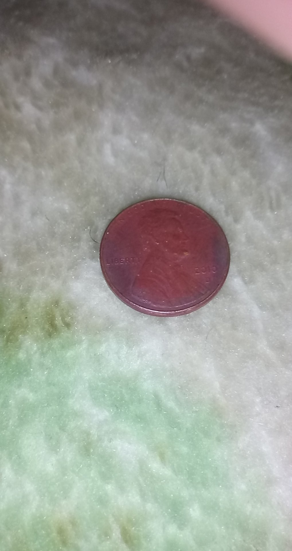 2010 is Copper Plated Zinc. The copper plating was exposed to the environment or some chemical which cause it to tone in a very dark manner. Whatever affected it is considered Environmental Toning.
