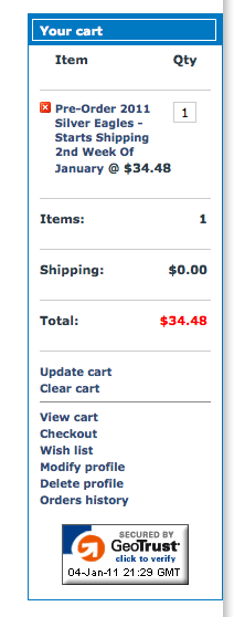 Just got an e-mail from mintproducts.com offering sales of ASE's on a pre-order basis. Went in and took a look around. They're going for $35 and some. Probably will change that price from time to time but that price hurts. Guess I'll have to forgo the two rolls I usually get and be satisfied with just a handful. I'll also forgo the pre-order thing too. I'll take my chances in the weeks to come. I think silver is gonna sputter a bit. Probably wishful thinking on my part.