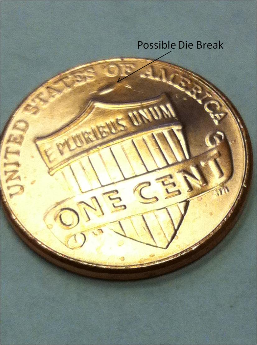 I can not tell by the pictures but a quick way to tell is if it is raised from the surface it is a die break. If it down in the surface it is usually post mint damage. The top one looks like a bag mark to me. That is where it was bumped by another coin.