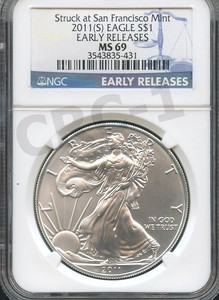 SOLD 2011-(s) ngc ms69 early release blue label silver american eagle .999 ($45-$52)