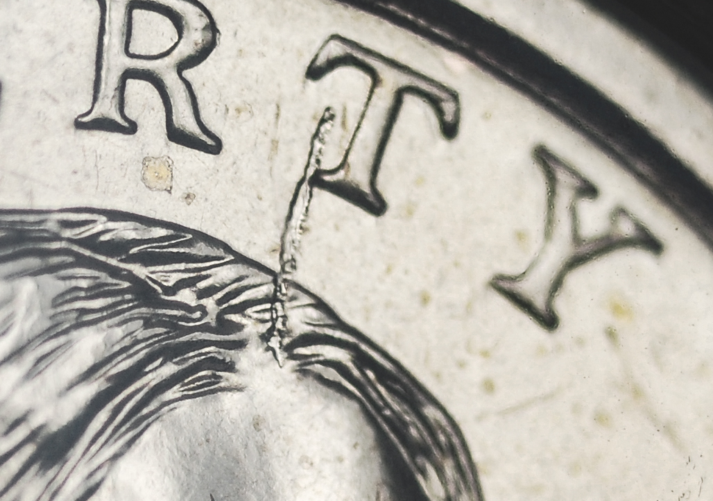 It looks at the start to be a lamination but just before and entering the hair appears to be twisted like a shard of metal or metal filing, so I will have to guess a struck through. Had it been cloth or a grease then the hair would have been blotted or missing more detail. It also appears too wide to be a wire bristle from a brush.