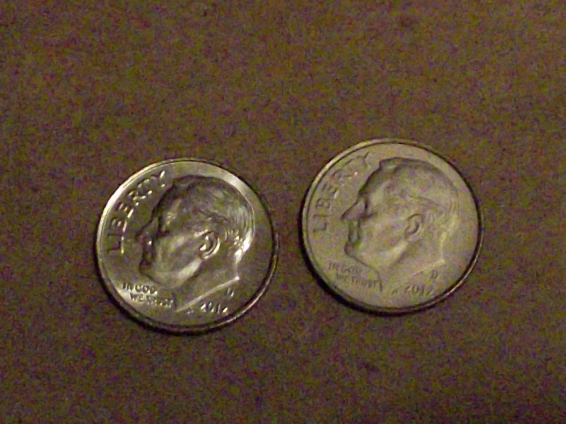 Here is a picture of the one I found on the right and a normal 2012d dime on the left. As you can tell my photography skills are lacking I just hope you can tell what I was referring to in my description. I just hope you can tell more by enlarging it or whatever with your computer. Please comment.